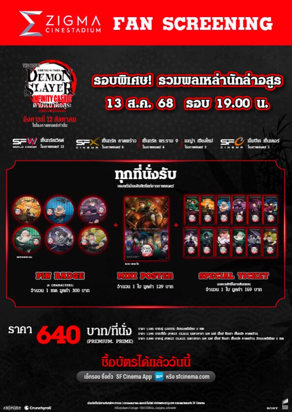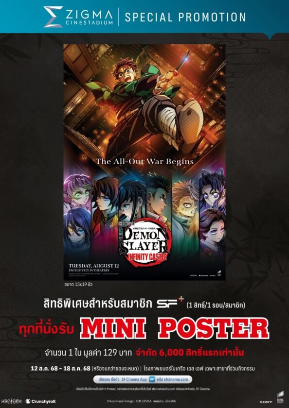 - สมาชิก SF+ ที่ซื้อบัตรชมภาพยนตร์เรื่อง “ดาบพิฆาตอสูรเดอะมูฟวี่: ศึกปราสาทไร้ขอบเขตองก์ที่ 1 : การกลับมาของอาคาสะ” ที่โรงภาพยนตร์ ZIGMA CINESTADIUMทุกที่นั่ง (ทุกช่องทางการจำหน่าย) รับมินิโปสเตอร์ลิขสิทธิ์แท้จากภาพยนตร์ 1 ใบ ( 1 ใบ / 1 รอบ / 1 สมาชิก ) ตั้งแต่วันที่ 12 สิงหาคม 2568 เป็นต้นไปจนตลอดโปรแกรมฉายหรือจนกว่าสินค้าจะหมด