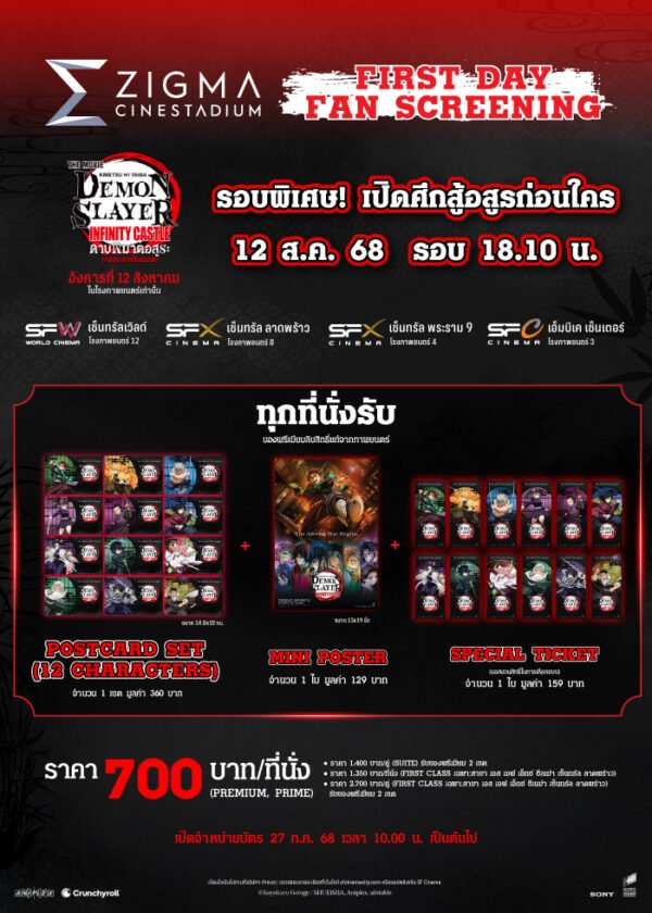 - รอบพิเศษ !! First Day Fan Screeningภาพยนตร์ “ดาบพิฆาตอสูรเดอะมูฟวี่: ศึกปราสาทไร้ขอบเขตองก์ที่ 1 : การกลับมาของอาคาสะ” ซื้อบัตรชมภาพยนตร์วันที่ 12 สิงหาคม 2568 รอบเวลา 18.10 น. กับระบบเสียงDolby Atmosและที่นั่งสบายที่สุดที่โรงภาพยนตร์ZIGMA CINESTADIUMเซ็นทรัลเวิลด์, เอสเอฟเอ็กซ์ซีเนม่าเซ็นทรัลลาดพร้าว, เอสเอฟเอ็กซ์ซีเนม่าเซ็นทรัลพระราม 9 และเอสเอฟซีเนม่าเอ็มบีเคเซ็นเตอร์ในราคาเริ่มต้น 700 บาททุกที่นั่งรับPostcard set 1 เซท (12 แบบ) ลิขสิทธิ์แท้จากภาพยนตร์