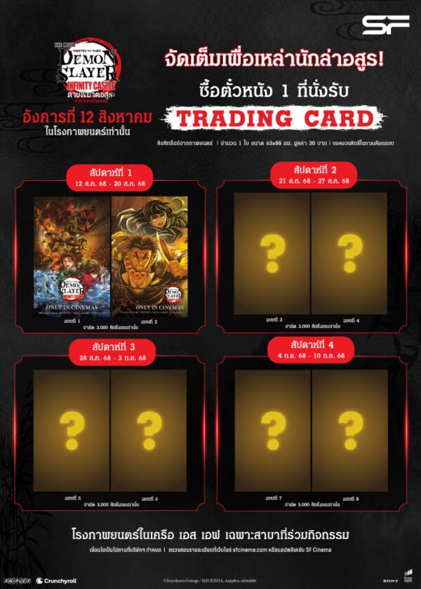 - เมื่อซื้อบัตรชมภาพยนตร์ “ดาบพิฆาตอสูรเดอะมูฟวี่: ศึกปราสาทไร้ขอบเขตองก์ที่ 1 : การกลับมาของอาคาสะ” รอบปกติทุกที่นั่ง (ทุกช่องทางการจำหน่าย) รับTrading Cardsลิขสิทธิ์แท้จากภาพยนตร์จำนวน 1 ใบ (สุ่มจาก 2 แบบ) ตั้งแต่วันที่ 12 สิงหาคม 2568 เป็นต้นไปจนตลอดโปรแกรมฉายหรือจนกว่าสินค้าจะหมด (แบ่งแจกรายสัปดาห์รวม 4 สัปดาห์ 8 แบบ)