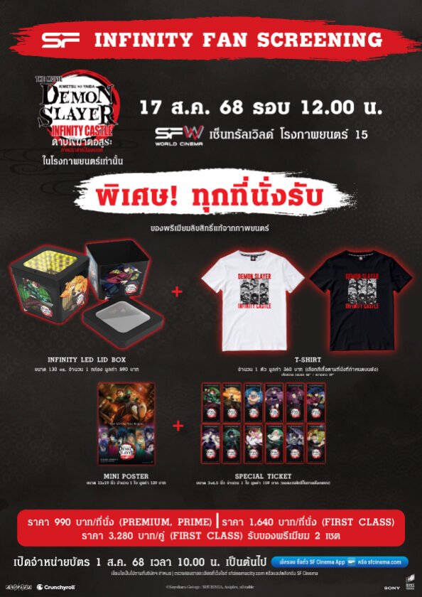 - รอบ Infinity Fan Screeningภาพยนตร์ “ดาบพิฆาตอสูรเดอะมูฟวี่: ศึกปราสาทไร้ขอบเขตองก์ที่ 1 : การกลับมาของอาคาสะ” ซื้อบัตรชมภาพยนตร์วันที่ 17 สิงหาคม 2568 รอบเวลา 12.00 น. ที่โรงภาพยนตร์ที่ 15 เอสเอฟเวิลด์ซีเนม่าเซ็นทรัลเวิลด์ในราคาเริ่มต้นที่นั่งละ 990 บาททุกที่นั่งรับของพรีเมียมลิขสิทธิ์แท้จากภาพยนตร์อาทิINFINITY LED LID BOXจำนวน 1 กล่องขนาด 130 ออนซ์, เสื้อยืดลายภาพยนตร์จำนวน 1 ตัว (ขอสงวนสิทธิ์ในการเลือกแบบ) ขนาดรอบอก 44 นิ้ว / ความยาว 29 นิ้ว, มินิโปสเตอร์ 1 ใบและSpecial Ticket 1 ใบ(แบบสุ่ม)