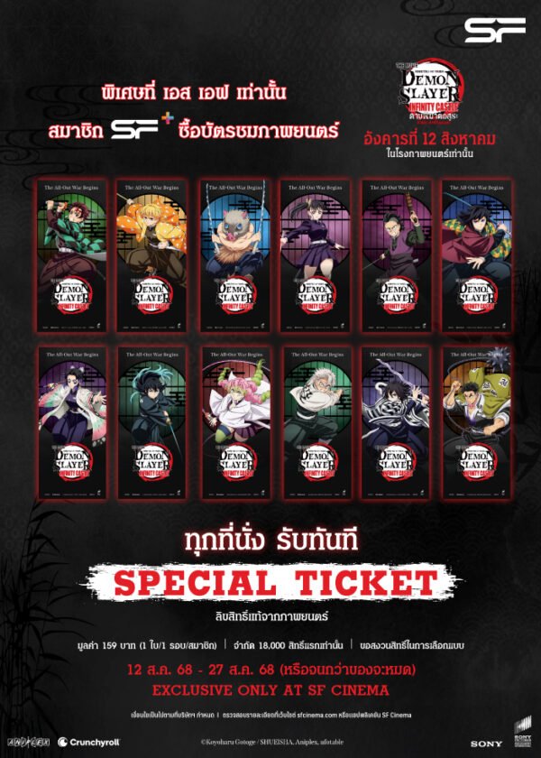 - สมาชิก SF+ ที่ซื้อบัตรชมภาพยนตร์ “ดาบพิฆาตอสูรเดอะมูฟวี่: ศึกปราสาทไร้ขอบเขตองก์ที่ 1 : การกลับมาของอาคาสะ” ทุกที่นั่งรับทันทีSPECIAL TICKETลิขสิทธิ์แท้จากภาพยนตร์ ( 1 ใบ / 1 รอบ / 1 สมาชิก ) มี 12 แบบให้สะสมตั้งแต่วันที่ 12 สิงหาคม 2568 เป็นต้นไปจนตลอดโปรแกรมฉายหรือจนกว่าสินค้าจะหมด