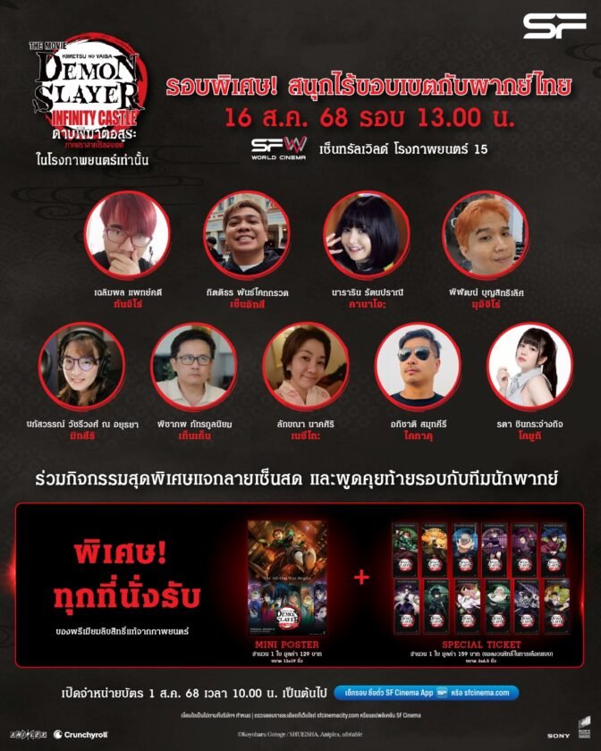 - รอบพิเศษ !! พากย์ไทยภาพยนตร์ “ดาบพิฆาตอสูรเดอะมูฟวี่: ศึกปราสาทไร้ขอบเขตองก์ที่ 1 : การกลับมาของอาคาสะ” ซื้อบัตรชมภาพยนตร์วันที่ 16 สิงหาคม 2568 รอบเวลา 13.00 น. ในระบบเสียงภาษาไทยที่โรงภาพยนตร์ที่ 15 เอสเอฟเวิลด์ซีเนม่าศูนย์การค้าเซ็นทรัลเวิลด์ (โรงภาพยนตร์ที่ 15) ทุกที่นั่งรับรับมินิโปสเตอร์ 1 ใบและ Special Ticket 1 ใบ(แบบสุ่ม) ลิขสิทธิ์แท้จากภาพยนตร์พร้อมพบกับกิจกรรมพิเศษจากทีมพากย์เสียงไทย