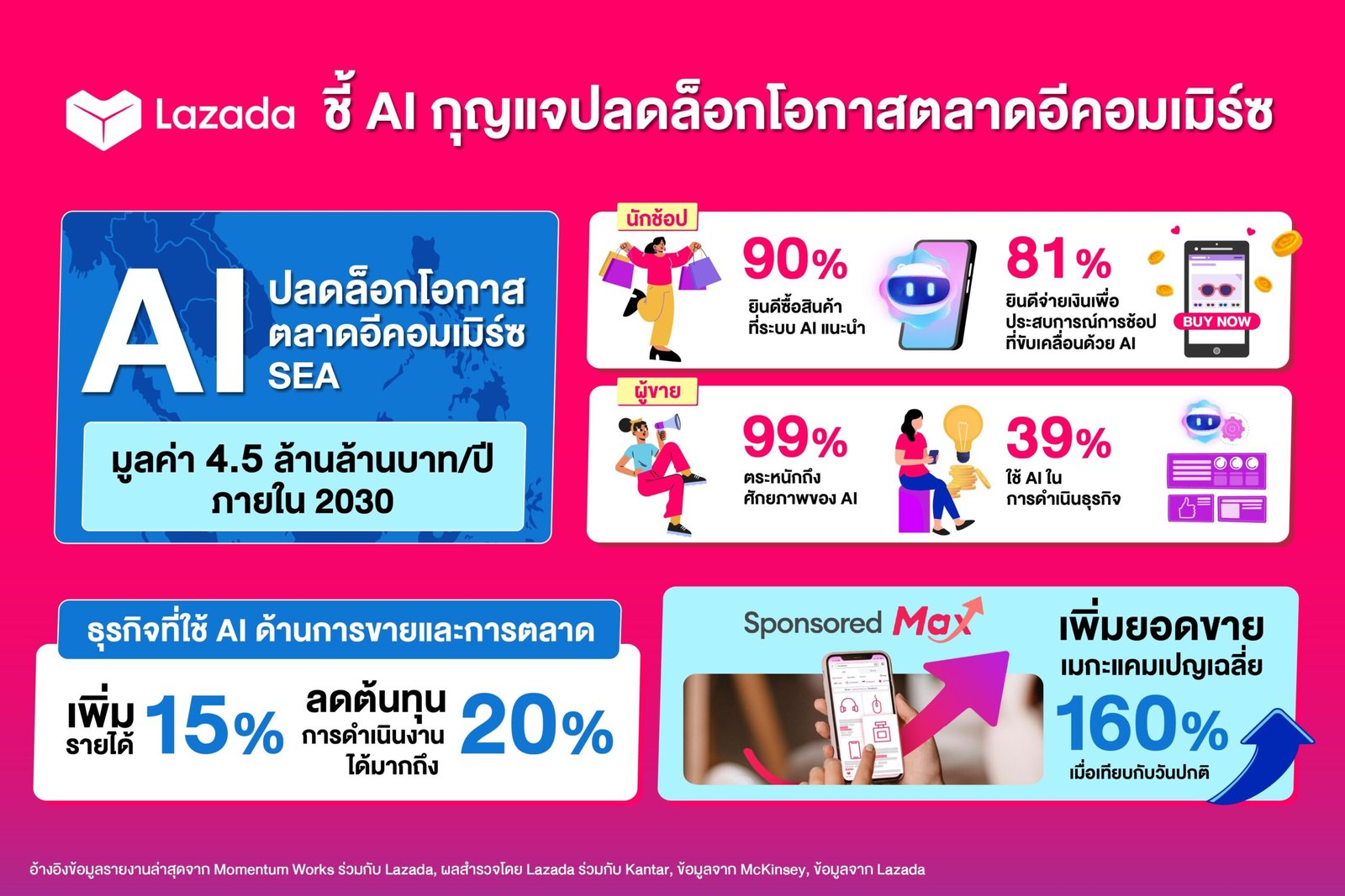 รายงานล่าสุดจาก Momentum Works ร่วมกับลาซาด้า เผยว่าหากผู้ขายในเอเชียตะวันออกเฉียงใต้สามารถใช้ศักยภาพของ AI ได้อย่างเต็มที่ จะสามารถปลดล็อกมูลค่าทางเศรษฐกิจในระบบนิเวศอีคอมเมิร์ซทั่วภูมิภาคได้สูงถึง 4.5 ล้านล้านบาทต่อปี (หรือราว 131 พันล้านดอลลาร์สหรัฐฯ) ภายในปี 2030 ตัวเลขนี้สะท้อนถึงโอกาสมหาศาลในการขับเคลื่อนธุรกิจอีคอมเมิร์ซให้เติบโตอย่างก้าวกระโดด ในฐานะผู้บุกเบิกแพลตฟอร์มอีคอมเมิร์ซในเอเชียตะวันออกเฉียงใต้ ลาซาด้าเล็งเห็นศักยภาพดังกล่าวตั้งแต่แรกเริ่ม และได้นำ AI มาเป็นพลังสำคัญที่ช่วยเสริมขีดความสามารถ ให้ผู้ขายไทยแข่งขันและเติบโตอย่างแข็งแกร่งต่อเนื่อง
