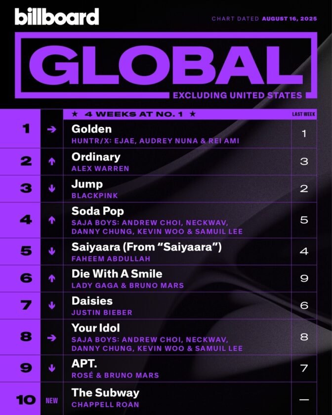 จึ้งปึ้งอย่างต่อเนื่อง! “Golden” ของวง HUNTR/X เพลงประกอบแอนิเมชัน KPop Demon Hunters ยังคงเดินหน้าทำลายสถิติใหม่ ๆ ไม่หยุด ล่าสุดสามารถขึ้นไปครองอันดับ 1 Billboard Hot 100 ได้สำเร็จ นับเป็นเพลง K-Pop เพลงที่ 8 ที่ทำได้ และทำให้ HUNTR/X เป็นเกิร์ลกรุ๊ปวงแรกในรอบ 24 ปีที่สามารถส่งเพลงขึ้นไปครองอันดับ 1 บนชาร์ตนี้ ต่อจาก Destiny’s Child กับเพลง “Bootylicious” ที่ปล่อยออกมาในปี 2001 รวมถึงชาร์ต Billboard Global 200 และ Billboard Global (Exclude US) ที่ครองอันดับ 1 มา 4 สัปดาห์แล้ว