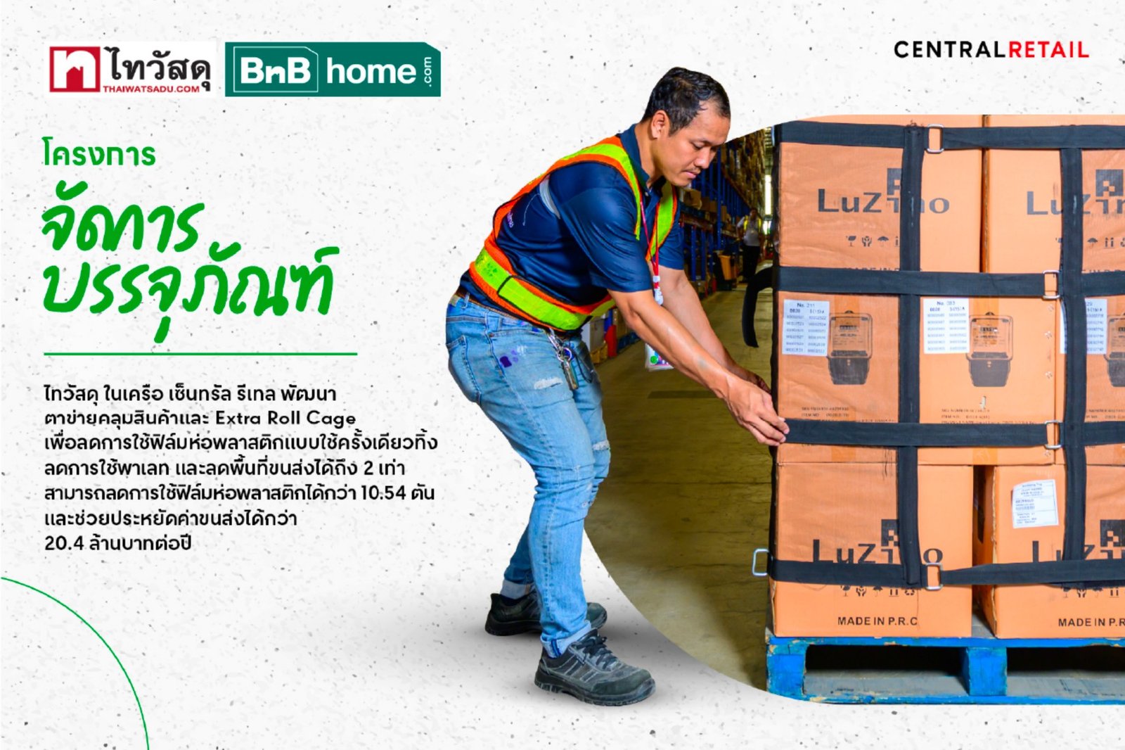 โครงการนี้เป็นความร่วมมือระหว่างศูนย์กระจายสินค้าไทวัสดุ และบีเอ็นบี โฮม กลุ่มธุรกิจฮาร์ดไลน์ และบริษัทพันธมิตร ที่ร่วมกันพัฒนาและออกแบบโซลูชันลดการใช้ฟิล์มพลาสติกหุ้ม ด้วย “ตาข่ายคลุมพาเลทสินค้า” ที่มีความยืดหยุ่น แข็งแรง ใช้สำหรับคลุมสินค้าบนพาเลทโดยไม่ต้องใช้ฟิล์มพลาสติกหุ้มแบบเดิม สามารถลดการใช้ฟิล์มห่อพลาสติกได้กว่า 10.54 ตันต่อปี นอกจากนี้ ได้มีการออกแบบและผลิต“Extra Roll Cage” เพื่อใช้บรรจุสินค้าที่มีความยาวพิเศษ มีโครงสร้างแข็งแรง ช่วยลดการใช้ฟิล์มพลาสติกและป้องกันการโค่นล้มระหว่างขนส่ง อีกทั้งสามารถลดพื้นที่ในการขนส่งได้มากขึ้นถึง 2 เท่า และช่วยประหยัดค่าใช้จ่ายในการขนส่งได้ถึง 20.4 ล้านบาทต่อปี ส่งผลเชิงบวกต่อกระบวนการจัดเก็บสินค้าในคลังและโลจิสติกส์ ในการช่วยลดปริมาณขยะพลาสติกลดคาร์บอนฟุตพริ้นต์ และลดการใช้พลังงานได้ในคราวเดียวกัน ซึ่งนับเป็นอีกก้าวสำคัญของการต่อยอดความตั้งใจของไทวัสดุ และบีเอ็นบี โฮม ในการขับเคลื่อน Zero Waste ให้เกิดขึ้นได้จริง ตั้งแต่คลังสินค้าจนถึงปลายทางของทุกการส่งมอบถึงมือผู้บริโภค