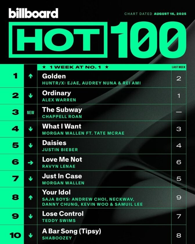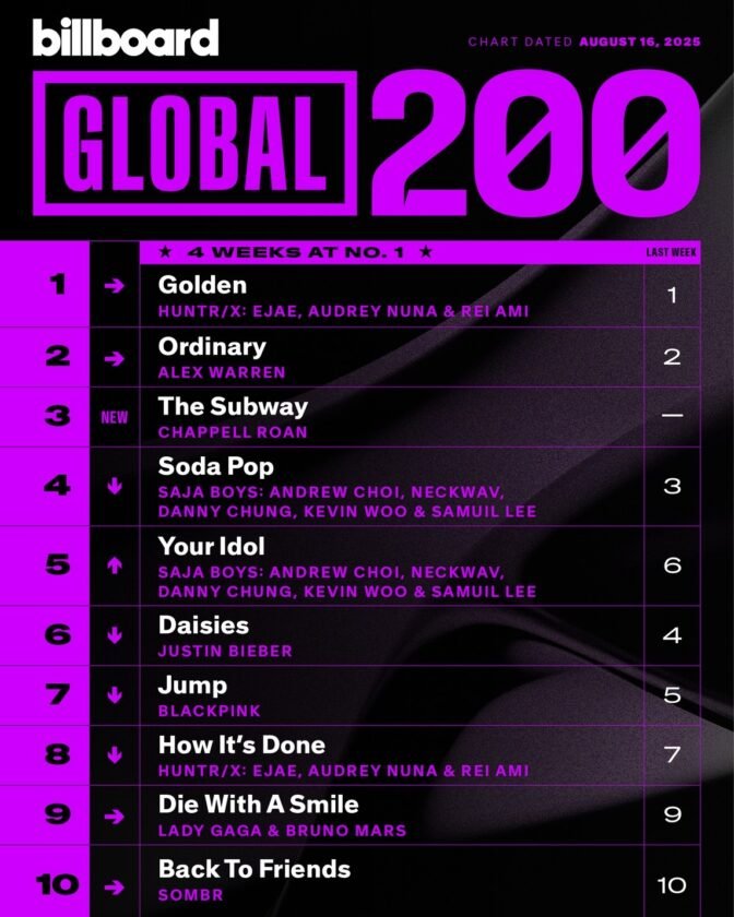 จึ้งปึ้งอย่างต่อเนื่อง! “Golden” ของวง HUNTR/X เพลงประกอบแอนิเมชัน KPop Demon Hunters ยังคงเดินหน้าทำลายสถิติใหม่ ๆ ไม่หยุด ล่าสุดสามารถขึ้นไปครองอันดับ 1 Billboard Hot 100 ได้สำเร็จ นับเป็นเพลง K-Pop เพลงที่ 8 ที่ทำได้ และทำให้ HUNTR/X เป็นเกิร์ลกรุ๊ปวงแรกในรอบ 24 ปีที่สามารถส่งเพลงขึ้นไปครองอันดับ 1 บนชาร์ตนี้ ต่อจาก Destiny’s Child กับเพลง “Bootylicious” ที่ปล่อยออกมาในปี 2001 รวมถึงชาร์ต Billboard Global 200 และ Billboard Global (Exclude US) ที่ครองอันดับ 1 มา 4 สัปดาห์แล้ว