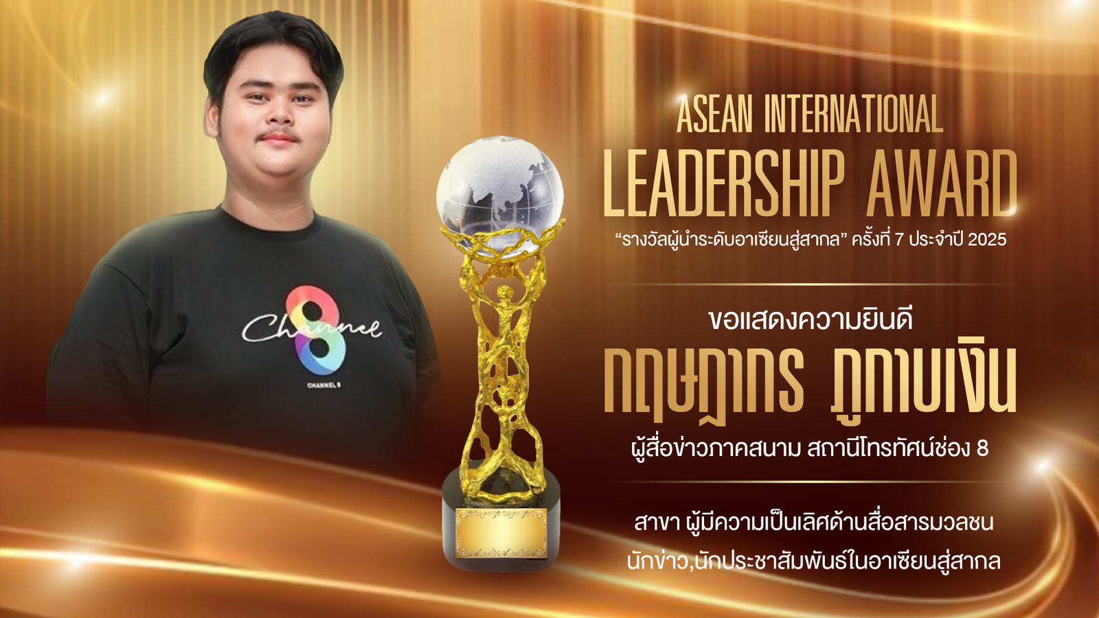 สถานีโทรทัศน์ช่อง 8 ในเครืออาร์เอสกรุ๊ป ตอกย้ำความมุ่งมั่นในการนำเสนอข่าวคุณภาพที่ถูกต้อง รวดเร็ว และน่าเชื่อถือ พร้อมสร้างผลงานระดับนานาชาติ ล่าสุด นายกฤษฎากร ภูกาบเงิน ผู้สื่อข่าวอาชญากรรม (ภาคสนาม) ข่าวออนไลน์ช่อง 8 สร้างชื่อเสียงให้วงการสื่อไทย คว้ารางวัล Asean International Leadership Award 2025 สาขาผู้มีความเป็นเลิศด้านสื่อสารมวลชนนักข่าว, นักประชาสัมพันธ์ในอาเซียนสู่สากลพิธีมอบรางวัลดังกล่าวจัดขึ้น ณ หอประชุมคุรุสภา กระทรวงศึกษาธิการ โดยมูลนิธิคุ้มเกล้าเยาวชนคนสร้างชาติ ร่วมกับกระทรวงศึกษาธิการ กระทรวงการพัฒนาสังคมและความมั่นคงของมนุษย์ และสมาคมวัฒนธรรมสยาม ซึ่งจัดต่อเนื่องเป็นปีที่ 7 แบ่งเป็น 2 ประเภท ได้แก่ Asean International Leadership Award “รางวัลผู้นำระดับอาเซียนสู่สากล” และ Asean International Youth Excellence Award “ผู้มีความเป็นเลิศระดับอาเซียนสู่สากล” โดยมี พล.อ.จรัญ กุลวนิช เป็นประธานมอบรางวัล