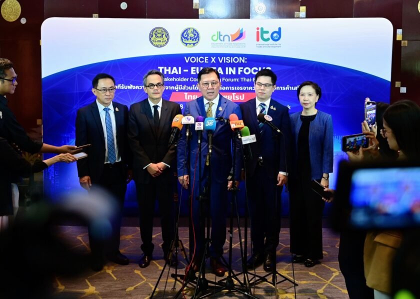 กระทรวงพาณิชย์โดยสถาบันระหว่างประเทศเพื่อการค้าและการพัฒนา (องค์การมหาชน) หรือ ITD กรมเจรจาการค้าระหว่างประเทศร่วมกับผู้แทนการค้าไทย จัดงาน ‘Voice x Vision: Thai-EU FTA in Focus’ (Stakeholder Consultation Workshop: Thai-EU FTA) เวทีรับฟังความคิดเห็นจากผู้มีส่วนได้ส่วนเสียต่อการเจรจาความตกลงการค้าเสรี ไทย–สหภาพยุโรป โดยมุ่งเน้นการหารือเชิงนโยบายด้านการเปิดตลาดสินค้า บริการ และการลงทุน ครอบคลุมทุกมิติ ผ่านการมีส่วนร่วมจากภาครัฐ เอกชน เกษตรกร ผู้ประกอบการ SMEs ภาคประชาสังคม และภาควิชาการ ก่อนเดินหน้าการเจรจาฯ รอบที่ 7 ในเดือนกันยายนนี้