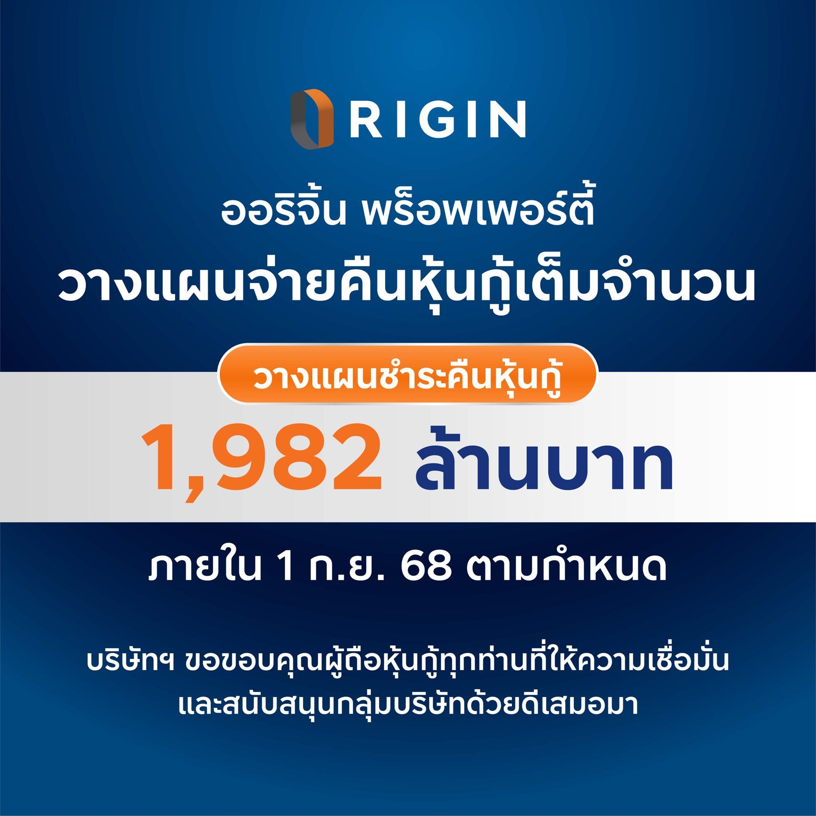 ออริจิ้นพร็อพเพอร์ตี้ โชว์สภาพคล่องทางการเงินแข็งแกร่งหนุนธุรกิจเดินหน้าเติบโตวางแผนชำระคืนหุ้นกู้ 2 ชุดจำนวน 1,982 ล้านบาทที่จะครบกำหนดในวันที่ 1 กันยายน 2568 โดยบริษัทฯมีความพร้อมในการชำระคืนเต็มจำนวนตามกำหนด