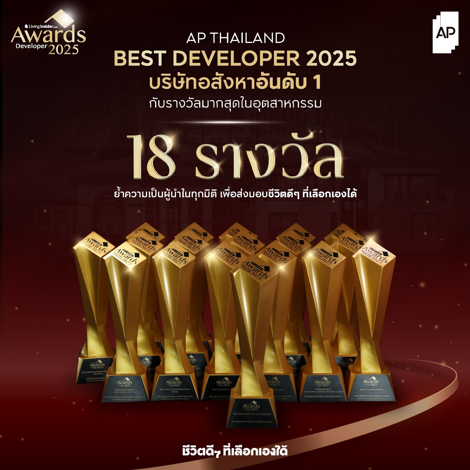 - ทุกรางวัลจากเวทีประกาศรางวัล LivingInsider Thailand Developer Awards 2025 ถือเป็นกำลังใจสำคัญและแรงผลักดันให้พนักงานเอพีกว่า 3,000 คนมุ่งมั่นพัฒนา ที่อยู่อาศัยคุณภาพและบริการที่ตอบโจทย์ทุกไลฟ์สไตล์ต่อไป