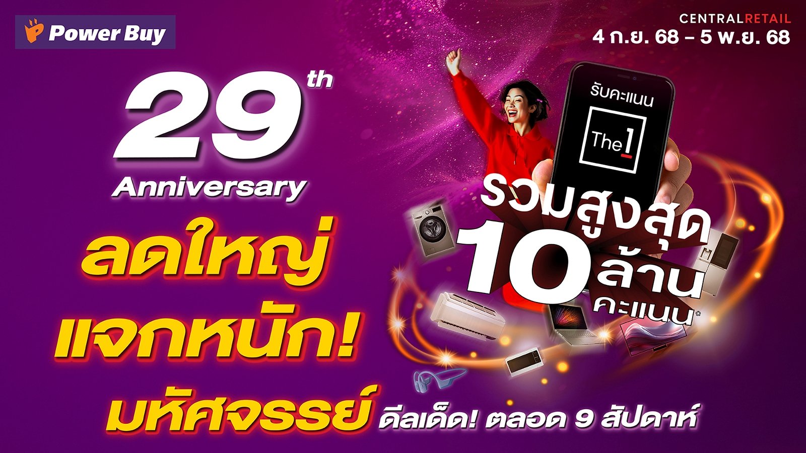 ทั้งนี้เพื่อขอบคุณลูกค้าในโอกาสครบรอบ 29 ปี ได้จัดแคมเปญใหญ่ “เพาเวอร์บาย 29 ปี มหัศจรรย์ดีลเด็ด ลดใหญ่จัดหนัก” ตลอด 9 สัปดาห์ ตั้งแต่วันที่ 4 ก.ย. – 5 พ.ย. 2568 อาทิ แจกคะแนน The 1 รวมกว่า 10 ล้านคะแนน และรับส่วนลดทันที 229 บาท เมื่อแลก The 1 เพียง 1,000 คะแนน, ลดสุดคุ้มเริ่มต้น 29%, ช้อปครบ 1,000 บาท รับสิทธิ์แลกซื้อสินค้าราคาเริ่มต้น 29 บาท, พิเศษ! นำเครื่องใช้ไฟฟ้าเก่ามาแลกรับส่วนลดเพิ่มสูงสุด 10,000 บาท, บริการผ่อน 0% ทั้งร้าน สูงสุด 15 เดือน พร้อมรับเครดิตเงินคืนสูงสุด 40,000 บาท กับบัตรเครดิตที่ร่วมรายการ พิเศษ..เมื่อช้อปกับบัตรเครดิตเซ็นทรัล เดอะวัน หรือบัตรเครดิตเซ็นทรัล เดอะวัน เฟิร์สช้อยส์ แลกคะแนนรับส่วนลดเพิ่ม 2,900 บาท, ฟรี! ค่าติดตั้งและจัดส่ง เพลิดเพลินกับกิจกรรมสุดเอ็กซ์คลูซีฟจากแบรนด์ดังที่หมุนเวียนมามอบประสบการณ์ช้อปแบบเต็มอิ่มทุกสัปดาห์ พบดีลพิเศษนี้ได้ที่ เพาเวอร์บายทุกสาขา ทั่วประเทศ และช่องทางออนไลน์ เว็บไซต์ www.powerbuy.co.th และ แอปพลิเคชัน http://bit.ly/PowerBuyApp และโซเชียลมีเดีย