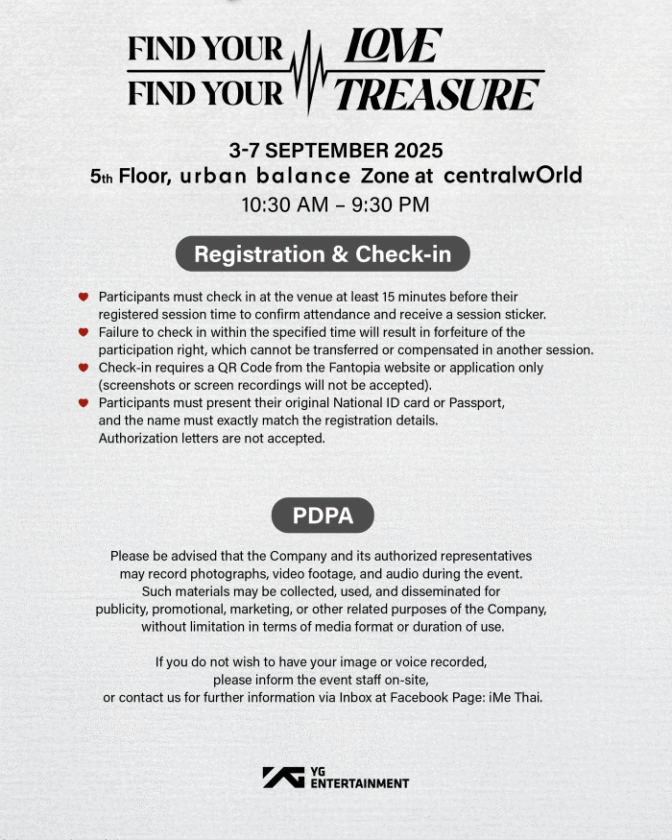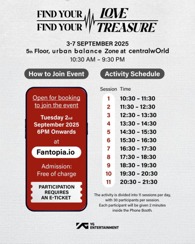 กลายเป็นพื้นที่สุดพิเศษ สำหรับทึเมชาวไทย โดยเตรียมยกความสนุกมาให้แฟนๆ ชาวไทยผ่านกิจกรรม FIND YOUR LOVE in BANGKOK ซึ่งประเทศไทยถูกชูสให้เป็นหนึ่งใน 3 ประเทศสุดพิเศษ ของการโปรโมท pop-up booth นอกเหนือจาก ประเทศเกาหลีใต้ และอินโดนีเซียด้วย โดยงานที่ประเทศไทยจะจัดขึ้นที่ ชั้น 5 โซน Urban Balance ศูนย์การค้าเซ็นทรัลเวิลด์ ที่เดียวเท่านั้น! ระหว่างวันที่ 3–7 กันยายนนี้ สำหรับงานนี้ทุกคนที่มาร่วมงานจะได้ โทรหา TREASURE แบบใกล้ชิด พร้อมรับ ของที่ระลึกสุดพิเศษ สำหรับผู้เข้าร่วมงานนี้ เข้าร่วมฟรี ไม่มีค่าใช้จ่าย หากต้องการร่วมกิจกรรม สามารถลงทะเบียนล่วงหน้าได้ที่ Fantopia.io นอกจากนี้แฟนๆ ยังสามารถมาชม และถ่ายภาพ TREASURE ได้จาก Digital Screen มากมาย ภายในศูนย์การค้าเซ็นทรัลเวิลด์ ตั้งแต่วันที่ 3-9 กันยายน 2568 บนจอ centralwOrld Digital Void Screen โซน Beacon, LED Main Entrance ด้านหน้าศูนย์การค้าฯและ LED Car Park ชั้น B1 อีกด้วย