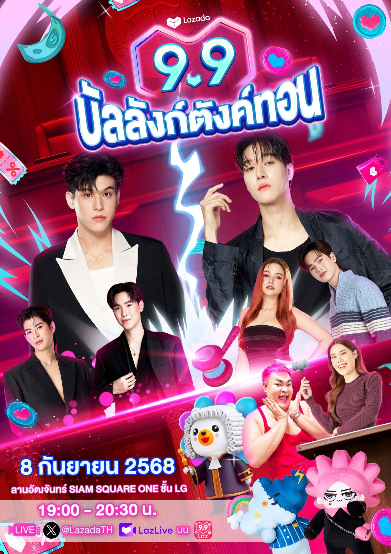 โค้งสุดท้ายก่อนแคมเปญ 9.9 จะเริ่มต้น เตรียมร่วมสนุกไปกับงาน Lazada 9.9 บัลลังก์ตังค์ทอน ณ ลานอัฒจันทร์ Siam Square One เปิดโอกาสให้ผู้โชคดี 150 คนได้ร่วมเป็น “ลาซลูกขุน” รับฟังคำตัดสินสุดฮา พร้อมสัมผัสประสบการณ์ความบันเทิงเต็มอิ่มจากศิลปินชื่อดังแถวหน้าของเมืองไทย ที่จะมาร่วมชี้ชะตาว่าใครคือผู้ที่ช้อปได้แบบไม่ต้องรู้สึกผิด นำทีมโดย สกาย–วงศ์รวี, นานิ–หิรัญกฤษฎิ์, จูเนียร์ ปณชัย, มาร์ค จิรันธนิน, มาร์ค ภาคิน, แซมมี่ ซาแมนท่า, ปิงปอง ธงชัย, ก็อตจิ ทัชชกร และมาสคอตที่มาแรงที่สุดในตอนนี้อย่างสไมล์และนีออนน่า สำหรับผู้ชมทางบ้าน สามารถร่วมติดตามบรรยากาศความสนุกไปพร้อมกันบน LazLive วันจันทร์ที่ 8 กันยายนนี้ เวลา 19.00 น. เป็นต้นไป