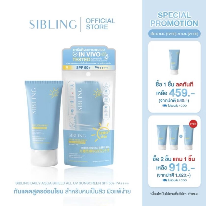 และสำหรับวันที่ 5-9 กันยายนนี้ จะเป็นอีกหนึ่งก้าวสำคัญของ Sibling ในการนำ ครีมกันแดด มาจัดโปรโมชันครั้งแรก ด้วยโปรโมชัน ซื้อสินค้า 1 ชิ้น ราคา 459 บาท หากซื้อ 2 ชิ้นแถม 1 ชิ้นในราคา 918 บาท