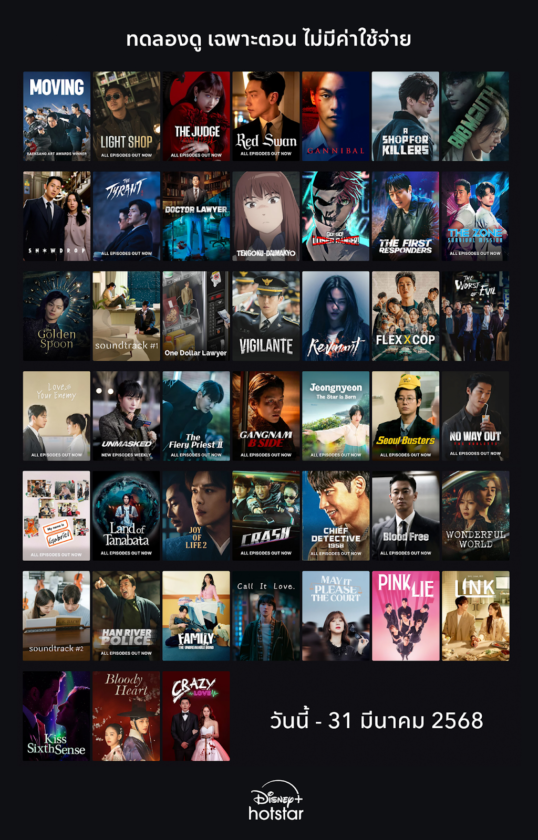 ห้ามพลาดโอกาสพิเศษในแคมเปญ “Valentry เทศกาลลองรัก” มาร่วมเปิดโลกแห่งความบันเทิงและค้นพบคอนเทนต์ที่คุณหลงรักได้ตลอดเดือนแห่งความรักกับ Disney+ Hotstar พร้อมทดลองชมคอนเทนต์เอเชียที่หลากหลายแนวแบบไม่มีค่าใช้จ่ายเฉพาะตอน ตั้งแต่วันที่ 10 กุมภาพันธ์ – 31 มีนาคม 2568 พบกับประสบการณ์สตรีมมิ่งสุดพิเศษที่พร้อมให้คุณค้นหาความสนุกในสไตล์ที่ใช่ สำหรับคุณและคนที่คุณรัก