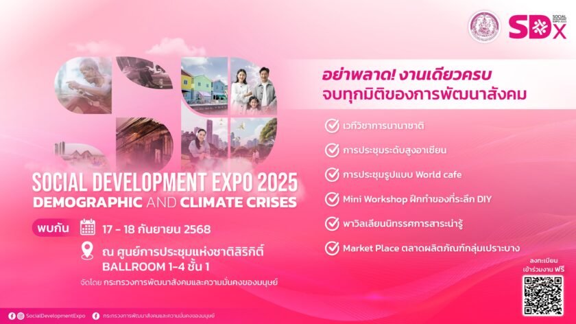 กระทรวงการพัฒนาสังคมและความมั่นคงของมนุษย์ (พม.) จัดงาน Social Development Expo 2025 (SDx 2025) ภายใต้หัวข้อ “Demographic and Climate Crises” ระหว่างวันที่ 17–18 กันยายน 2568 ณบอลรูม 1-4 ชั้น 1 ศูนย์การประชุมแห่งชาติสิริกิติ์ เพื่อเป็นเวทีระดับชาติและนานาชาติในการเสริมสร้างความร่วมมือจากภาคีเครือข่ายทุกภาคส่วนของสังคมทั้งในและต่างประเทศ สำหรับการเตรียมความพร้อมรับมือและการจัดการ “วิกฤตซ้อนวิกฤต : โครงสร้างประชากรและสภาพภูมิอากาศ” ซึ่งส่งผลกระทบรุนแรงต่อกลุ่มเปราะบางและประชาชนทุกคน ไม่ว่าจะเป็นเด็ก เยาวชน สตรี ผู้สูงอายุ คนพิการ และผู้ด้อยโอกาสในสังคม
