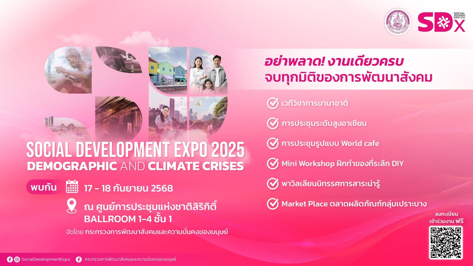 ขอเชิญประชาชนผู้สนใจเข้าร่วมงาน Social Development Expo 2025 (SDx 2025) ภายใต้หัวข้อ “Demographic and Climate Crises” ระหว่างวันที่ 17–18 กันยายน 2568 ณบอลรูม 1-4 ชั้น 1 ศูนย์การประชุมแห่งชาติสิริกิติ์ เพื่อร่วมกันจัดการและหาทางออกจากวิกฤตซ้อนวิกฤต โดยเราทุกคนต้องร่วมมือ รวมพลังกัน เพราะไม่ใช่เป็นหน้าที่ของคนใดคนหนึ่ง หรือหน่วยงานใดหน่วยงานหนึ่ง ทั้งนี้ ติดตามรายละเอียดเพิ่มเติมได้ที่ เฟซบุ๊กกระทรวงการพัฒนาสังคมและความมั่นคงของมนุษย์ : https://www.facebook.com/share/1AVVt5UNCK/