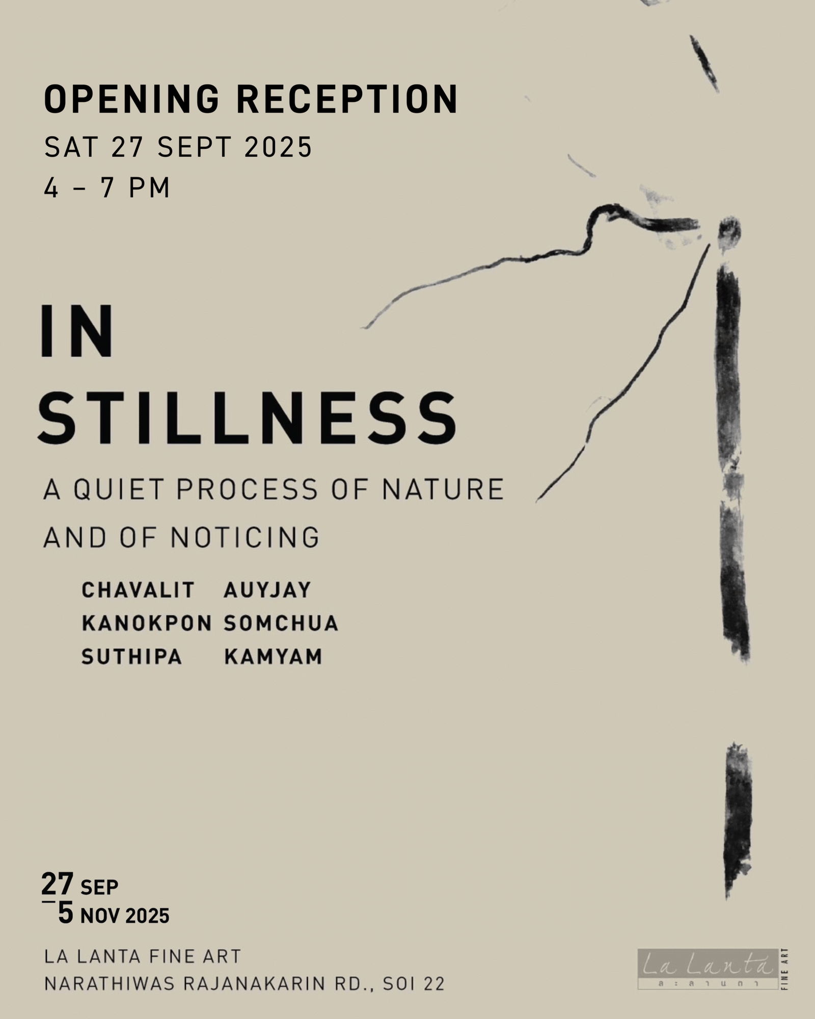 นิทรรศการ In Stillness จัดแสดงผลงานของศิลปินผู้เฝ้ามองธรรมชาติ หวังถ่ายทอดความคิดความรู้สึก ทั้งจุดประกายให้ผู้ชมได้หยุดมอง และรับฟังสิ่งรอบตัว เพื่อเกิดสัมผัสบางสิ่งภายในใจของตนเอง