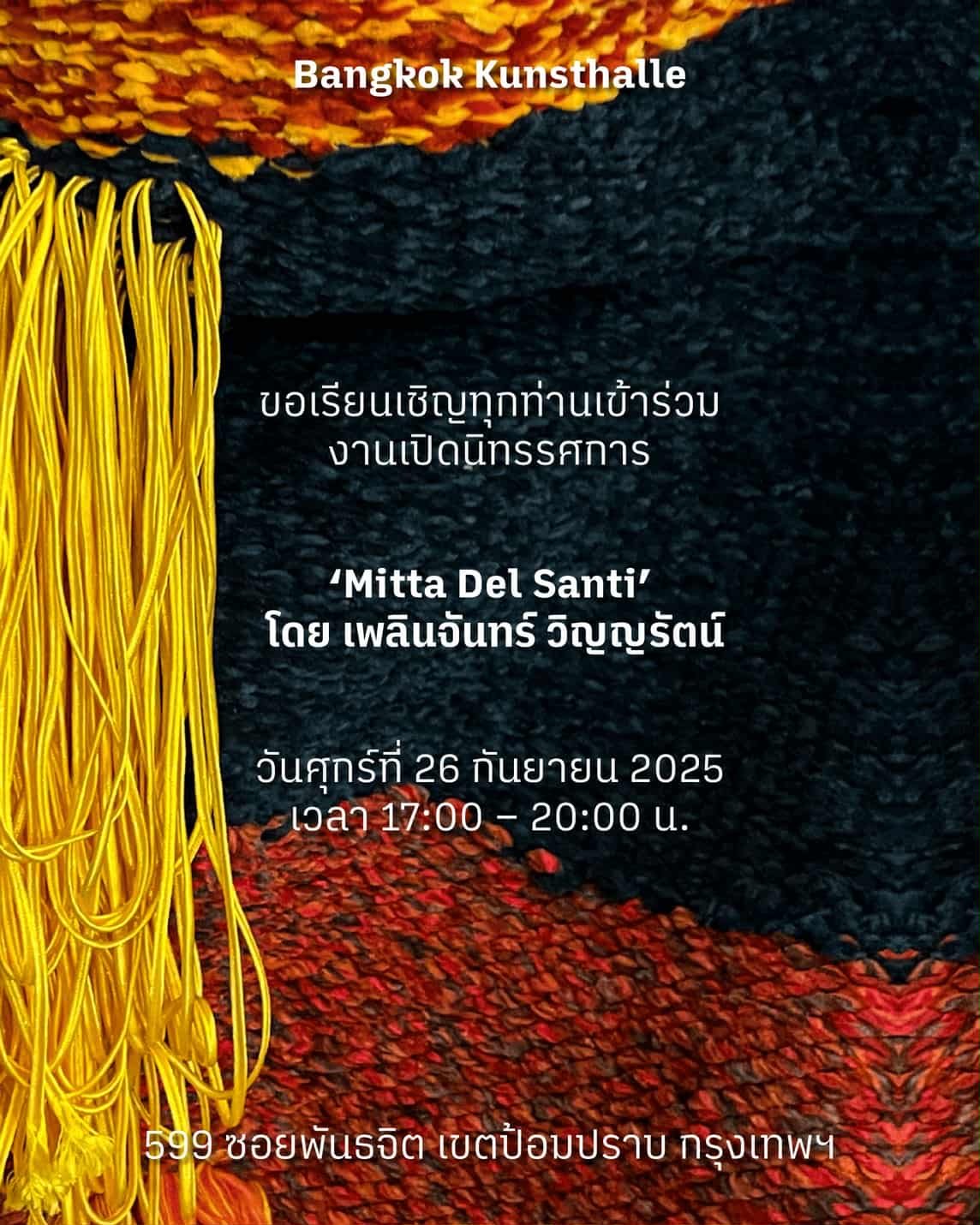 ‘Mitta del Santi’ จัดแสดงตั้งแต่วันที่ 26 กันยายน -30 พฤศจิกายน 2568 เวลา14.00 – 20.00น. ชั้น 1 บางกอกคุนส์ฮาเลอ (ปิดทุกวันจันทร์และวันอังคาร) เขตป้อมปราบศัตรูพ่าย กรุงเทพฯ ติดตามความเคลื่อนไหวได้ที่
