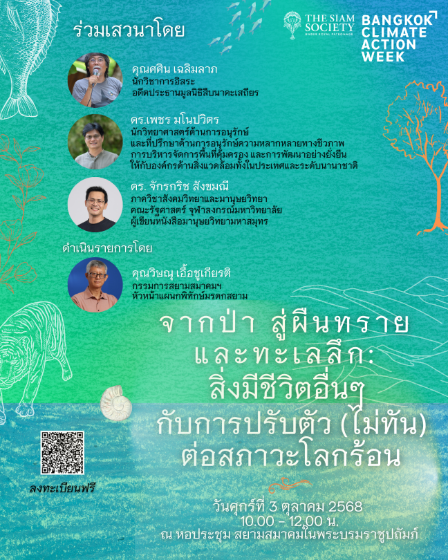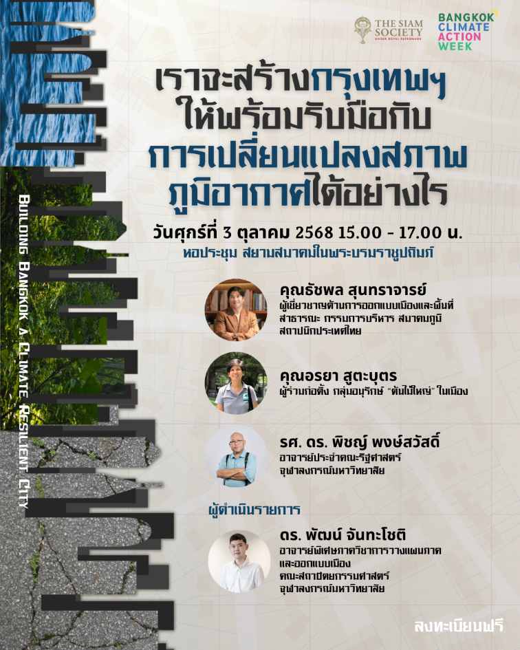 สยามสมาคมฯ ยินดีต้อนรับผู้ที่สนใจเข้าร่วมกิจกรรมในสัปดาห์ Bangkok Climate Action Week 2025 โดยกิจกรรมทั้งหมดจะจัดขึ้นที่หอประชุมสยามสมาคมฯ เลขที่ 131 ถนนสุขุมวิท 21 กรุงเทพฯ เข้าร่วมฟรีทุกกิจกรรม โดยต้องลงทะเบียนล่วงหน้า (www.thesiamsociety.org)