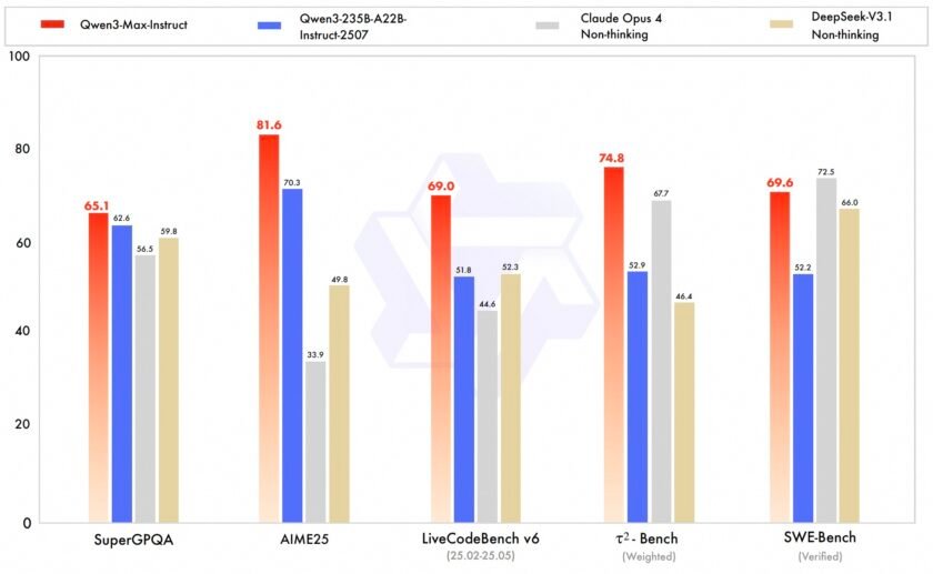 อาลีบาบา ได้เปิดตัว Qwen3-Max อย่างเป็นทางการในฐานะโมเดล LLM ขนาดใหญ่ที่สุดที่มีพารามิเตอร์กว่า 1 ล้านล้านตัว ด้วยโหมด Instruct (non-thinking) และ Thinking โมเดลนี้บรรลุประสิทธิภาพที่น่าประทับใจในการทำเบนช์มาร์ก (benmarks) ที่หลากหลาย โดยเฉพาะอย่างยิ่งในการสร้างโค้ดและความสามารถของเอเจนต์ สำหรับโหมด instruct ได้คะแนน 69.6 ใน SWE-Bench ซึ่งเป็นเบนช์มาร์กมาตรฐานสำหรับการประเมิน LLM ในประเด็นการใช้งานซอฟต์แวร์จริง ซึ่งเทียบเท่ากับโมเดลปิดชั้นนำบางรุ่น นอกจากนี้ยังทำสถิติคะแนนประสิทธิภาพที่โดดเด่นใน Tau2-Bench ซึ่งเป็นเบนช์มาร์กที่ประเมิน เอเจนต์สนทนา แสดงให้เห็นถึงความเชี่ยวชาญพิเศษในการใช้เครื่องมือ ที่ถือเป็นความสามารถพื้นฐานสำหรับการสร้างเอเจนต์ที่ชาญฉลาดและเน้นการดำเนินการ