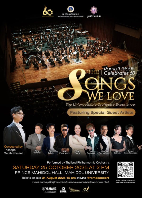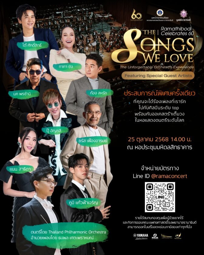 เนื่องในโอกาสครบรอบ 60ปี แห่งการก่อตั้งคณะแพทยศาสตร์โรงพยาบาลรามาธิบดี มหาวิทยาลัยมหิดล สมาคมศิษย์เก่าแพทย์รามาธิบดี ร่วมกับ มูลนิธิรามาธิบดีฯ, วิทยาลัยดุริยางคศิลป์ มหาวิทยาลัยมหิดล และ Thailand Philharmonic Orchestra ขอเชิญชวนทุกท่านร่วมสร้าง “คำว่าให้…ไม่สิ้นสุด” ผ่านคอนเสิร์ตการกุศล “Ramathibodi Celebrates 60: The Songs We Love”