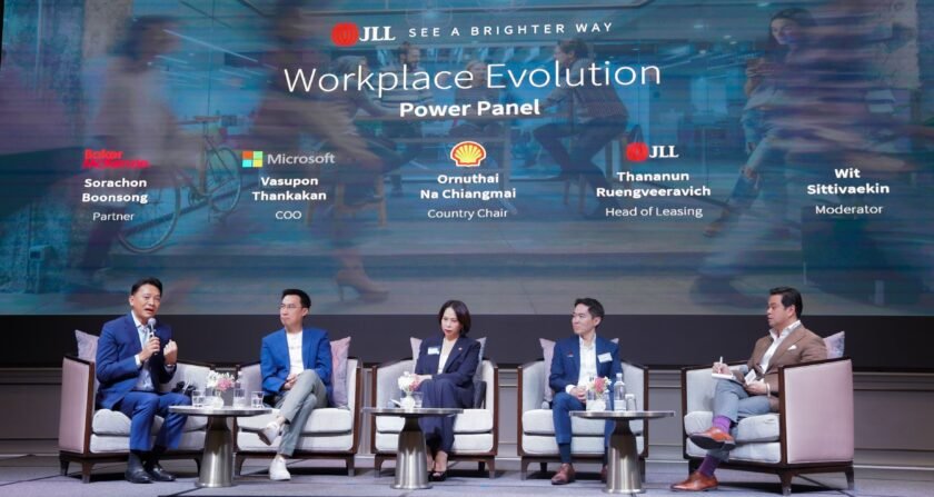 คำบรรยายภาพ: จากซ้ายไปขวา: นายสรชน บุญสอง Partner บริษัท เบเคอร์ แอนด์ แม็คเค็นซี่ จำกัด, นายวสุพล ธารกกาญจน์ ประธานเจ้าหน้าที่ฝ่ายปฏิบัติการ บริษัท ไมโครซอฟท์, นางสาวอรอุทัย ณ เชียงใหม่ ประธานกรรมการ บริษัท เชลล์, นายธนานันต์ เรืองวีรวิชญ์ หัวหน้าแผนกบริการตัวแทนด้านการเช่าอาคารสำนักงาน เจแอลแอล และนายวิทย์ สิทธิเวคิน ผู้ดำเนินรายการ