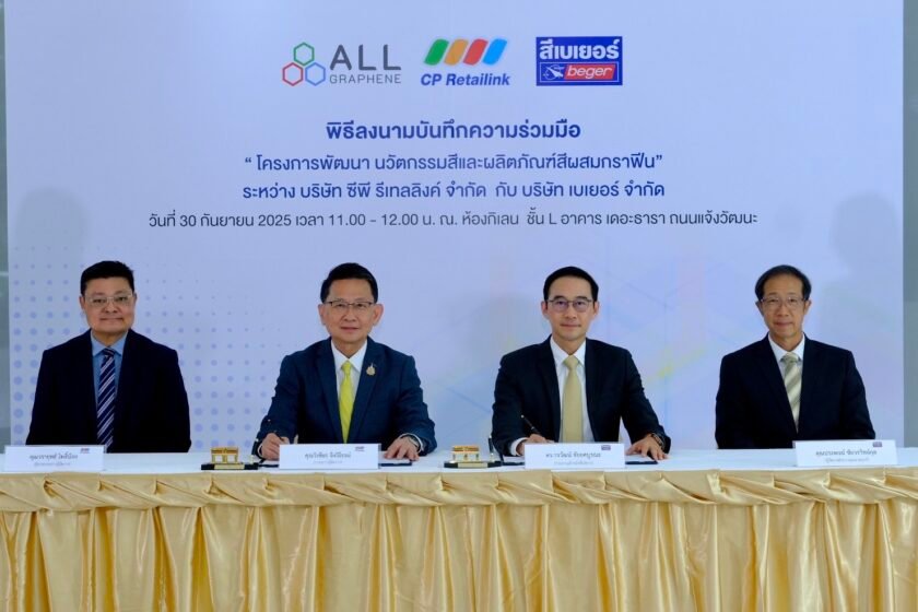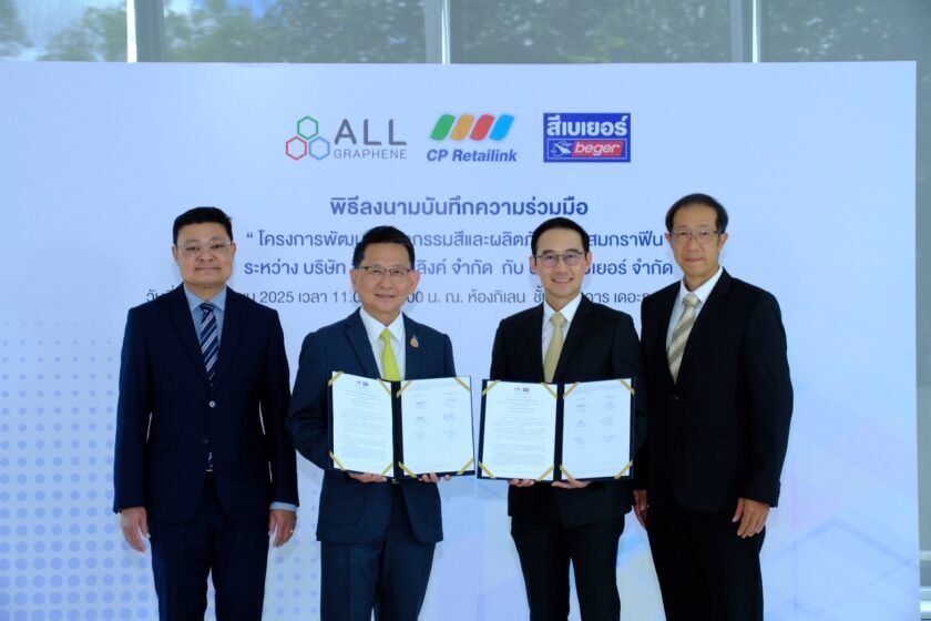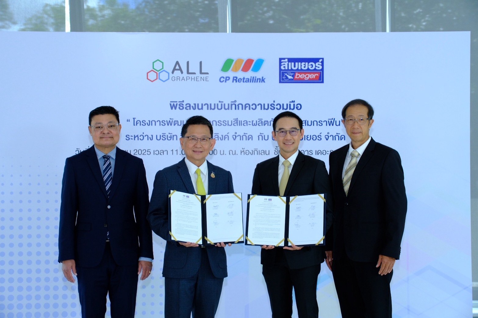 บริษัท เบเยอร์ จำกัด (Beger) ผู้นำด้านนวัตกรรมสีทาอาคารและเคมีภัณฑ์ก่อสร้างของไทยร่วมกับบริษัทซีพีรีเทลลิงค์จำกัด (CP Retailink) ผู้นำโซลูชันระบบค้าปลีกและผู้พัฒนาวัสดุกราฟีน ลงนามบันทึกข้อตกลงความร่วมมือทางวิชาการ (MOU) เพื่อพัฒนา “Graphene for Paint Technology” นวัตกรรมใหม่สำหรับสีรุ่นใหม่ที่ต่อยอดการใช้วัสดุกราฟีนในอุตสาหกรรมสีและเคมีภัณฑ์ก่อสร้าง ณ ห้องกิเลน ชั้น L เดอะ ธารา แจ้งวัฒนะ
