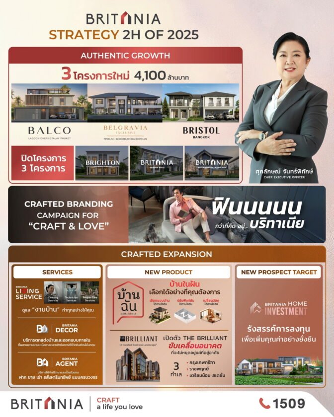 “บริทาเนีย” เดินหน้าเติบโตอย่างต่อเนื่องในครึ่งปีหลัง ตอกย้ำความเป็นผู้นำด้านการพัฒนาโครงการที่อยู่อาศัยแนวราบ ด้วยแนวทางการดำเนินงานที่ตอบโจทย์ทุกความต้องการของลูกค้าอย่างตรงกลุ่ม ผ่าน 3 แกนหลักสำคัญ ได้แก่ AUTHENTIC GROWTH STRATEGY, CRAFTED BRANDING CAMPAIGN FOR “CRAFT&LOVE” และ CRAFTED EXPANSION ซึ่งสะท้อนถึงวิสัยทัศน์ขององค์กรที่ก้าวข้ามกรอบเดิม มุ่งสร้างโอกาสใหม่แห่งการเติบโต และขยายฐานลูกค้าอย่างยั่งยืน