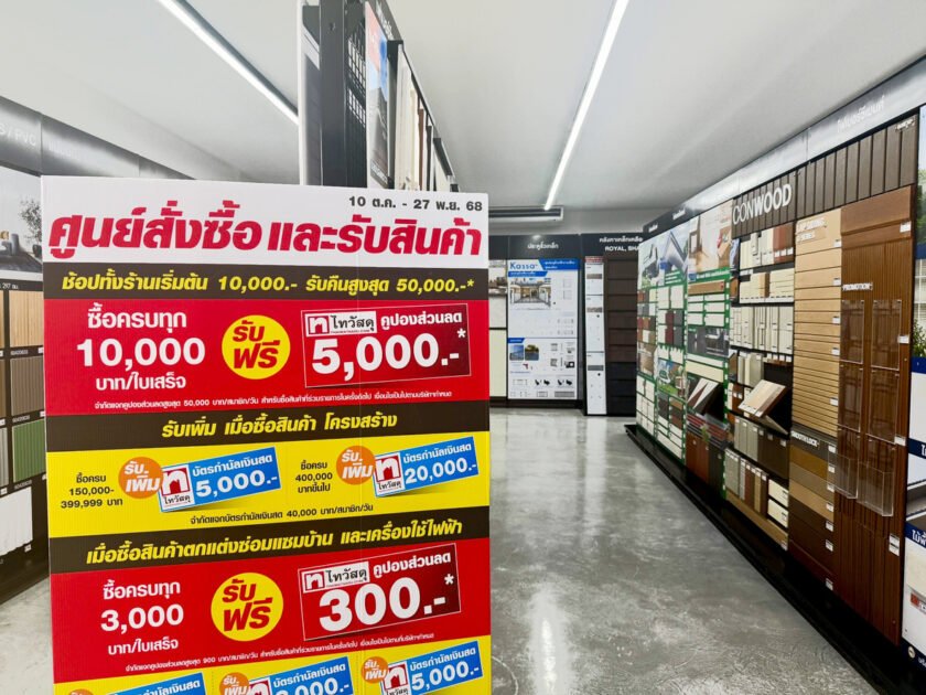 - ช้อปสินค้ากลุ่มตกแต่ง ซ่อมแซมบ้าน และเครื่องใช้ไฟฟ้า 5,000 บาทขึ้นไป/ใบเสร็จ หรือช้อปสินค้ากลุ่ม โครงสร้าง 10,000 บาทขึ้นไป/ใบเสร็จ รับสิทธิ์ ส่งฟรี 60 กม. (ส่วนลดค่าขนส่งสูงสุด 900 บาท*)