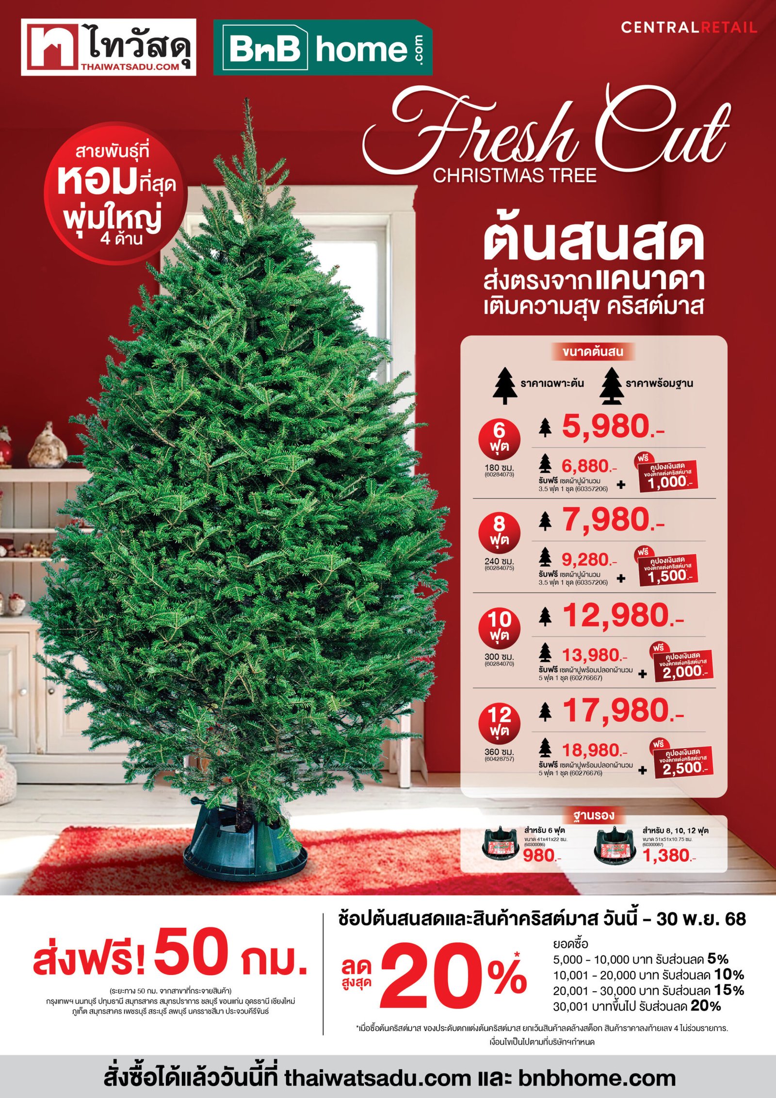 สำหรับ ต้นคริสต์มาสสด จากไทวัสดุ และ บีเอ็นบี โฮม เป็นต้นสนที่ปลูกแบบออร์แกนิก ปราศจากสารเคมี ตั้งแต่การเพาะปลูกจนถึงการขนส่ง ทุกต้นผ่านกระบวนการตัดแต่งและเก็บรักษาในสภาวะควบคุมอุณหภูมิอย่างเข้มงวด เพื่อรักษามาตรฐาน คุณภาพความสดใหม่ และรูปทรงสมบูรณ์แบบ จนถึงมือผู้ซื้อ ซึ่งในปีนี้มีให้เลือกถึง 4 ขนาด พร้อมของสมนาคุณสุดพิเศษในทุกการสั่งซื้อ เพื่อรองรับการแต่งบ้าน และธุรกิจร้านในแบบที่ต่างกัน ได้แก่: