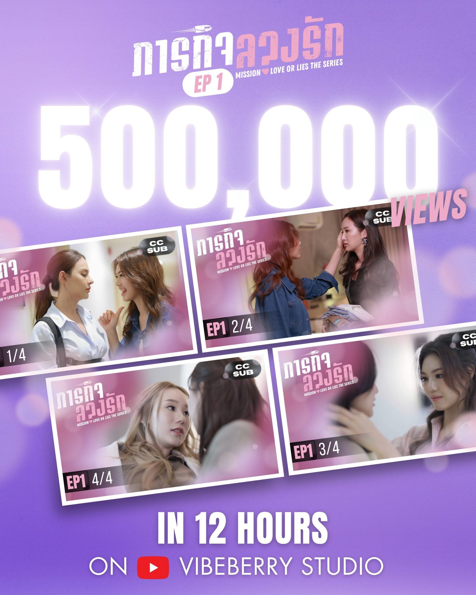 กระแสแรง ตั้งแต่อีพีแรก สำหรับซีรีส์ “Mission Love or Lies ภารกิจลวงรัก“ ซีรีส์ฟอร์มดีเคมีแรงแห่งปีเรื่องแรกจากค่าย Vibeberry Studio ที่เพิ่งประเดิมภารกิจแรกบน YouTube ไปเมื่อวันพุธที่ 29 ตุลาคมที่ผ่านมา ได้สร้างปรากฏการณ์กระแสตอบรับอย่างล้นหลาม เพียงไม่ถึง 12 ชั่วโมงหลังออนแอร์ ยอดวิวรวมทะยานพุ่งสูงถึง 500,000 ครั้ง และยังคงพุ่งขึ้นอย่างต่อเนื่องจนถึงขณะนี้ นอกจากยอดวิวที่แรงไม่หยุดแล้ว คอมเมนต์จากแฟน ๆ ทั่วประเทศยังแห่กันมา “ลงเรือ“ เชียร์เคมีสุดฟินของ 4 สาวนักแสดงนำอย่างล้นหลาม ต่างคาแรกเตอร์แต่ลงตัวจนต้องจับตาดู!