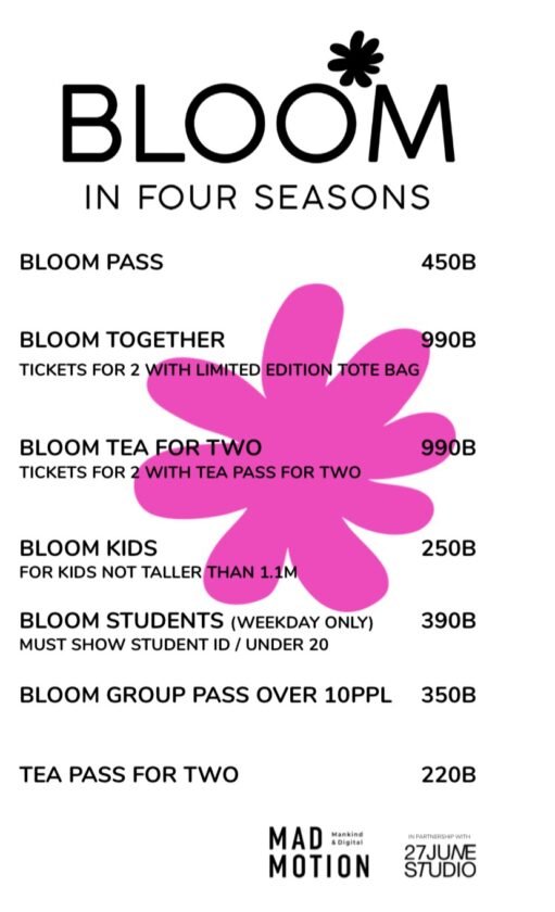 “BLOOM in Four Seasons” ประสบการณ์ที่ออกแบบมาอย่างละเมียดละไมให้ทุกโสตสัมผัสได้หยุดพัก หายใจเข้า-ออก ฮีลความรู้สึกและสร้างแรงบันดาลใจ พร้อมเปิดให้จองบัตรแล้ววันนี้ สามารถซื้อล่วงหน้าได้ที่ https://www.ticketmelon.com/madmotionstudio/Bloominfourseasons หรือที่เคาน์เตอร์บัตร ณ Attraction Hall ชั้น 6 ไอคอนสยาม ตั้งแต่วันที่ 7 พฤศจิกายน 2568 จนถึงวันที่ 15 มีนาคม 2569
