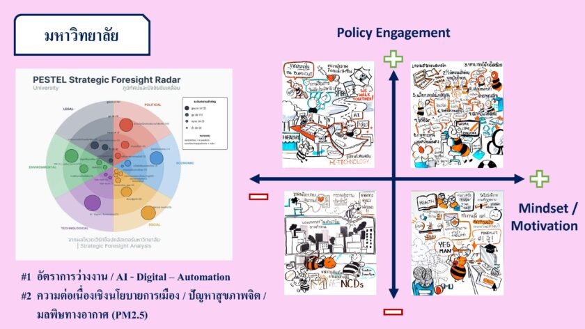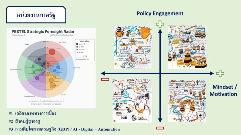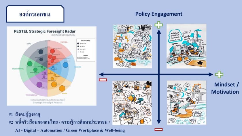 พุ่งสูงขึ้น และ AI-Digital-Automation ที่เข้ามาเปลี่ยนโลกการทำงาน ทำให้ทักษะแรงงานเดิมเสี่ยงถูกทิ้งไว้ข้างหลัง นอกจากนี้แต่ละองค์กรยังมีปัจจัยเฉพาะที่ต้องเผชิญ เช่น ภาคเอกชนต้องรับมือกับปัญหาหนี้ครัวเรือนสูง ภาครัฐ