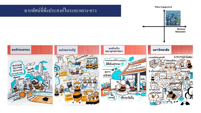 ฉากทัศน์อนาคต “Foresight 2035 and Strategic Roadmap: Future of Well-being Organizations” ฉายภาพอนาคตสุขภาวะองค์กรไทยในอีก10ปีข้างหน้า 4 องค์กรหลักได้แก่ เอกชน-รัฐ-วัด-มหาวิทยาลัย ผ่าน 16 ฉากทัศน์ ตั้งแต่ฉากทัศน์ในอุดมคติ ความเสี่ยงที่ต้องเผชิญ ไปจนถึงความเลวร้ายที่ต้องรับมือ ชี้หากไม่เร่งสร้างสุขภาวะที่ดีตั้งแต่วันนี้ องค์กรอาจต้องเผชิญวิกฤต Burnout ซึมเศร้า NCDs สมองไหล พร้อมเสนอ Roadmap นำทาง