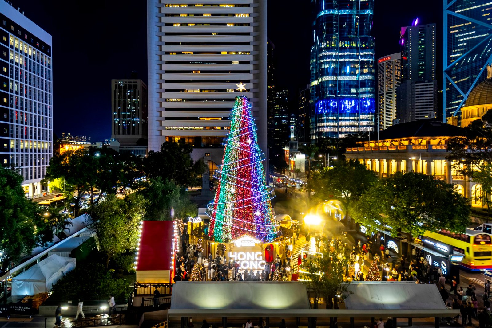 สวน Statue Square ในย่านเซ็นทรัลถูกเนรมิตให้กลายเป็น Christmas Town ที่เต็มไปด้วยชีวิตชีวาและบรรยากาศฤดูหนาวสุดมหัศจรรย์ พร้อมเสียงเพลงคริสต์มาสคลาสสิกที่ดังกังวานไปทั่วบริเวณ ต้นคริสต์มาสสูง 20 เมตร เทียบเท่าอาคารหกชั้น ประดับด้วยแสงไฟหลากสีและลวดลายงดงาม อีกทั้งยังมีต้นคริสต์มาสขนาดเล็กอีก 28 ต้น ที่ตกแต่งด้วยเครื่องประดับสีทอง สีแดง และทองแดงอย่างสวยงาม Christmas Town ยังเต็มไปด้วยของเล่นคลาสสิกขนาดยักษ์ ทั้งเครื่องบิน รถจี๊ป รถไฟ และบอลลูนอากาศ รวมถึงหุ่นตุ๊กตาที่มอบของขวัญให้กับผู้คนที่เดินผ่านไปมา สร้างความรู้สึกเหมือนหลุดเข้าไปในวันคริสต์มาสแห่งเทพนิยาย รายละเอียดเล็ก ๆ น่ารักอย่างนาฬิกาวินเทจและลูกกวาดรูปหัวใจก็ช่วยเพิ่มเสน่ห์ให้กับเมืองจำลองนี้ รถไฟจำลองย่อส่วนจะออกวิ่งทุก 20 นาที พร้อมเสียง “ปู๊น ปู๊น” และเอฟเฟกต์ควันให้ผู้มาเยือนได้เก็บภาพความทรงจำอย่างสนุกสนาน ส่วน Starlight Train Station ที่ประดับด้วยแสงระยิบระยับจะตั้งตระหง่านต้อนรับผู้มาเยือนสู่การเดินทางฤดูหนาวอย่างอบอุ่น