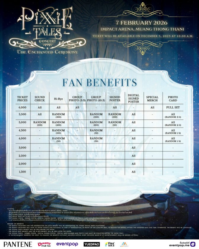 เตรียมตัวให้พร้อม วอร์มนิ้วให้ดี จับจองที่นั่งพร้อมกัน “PiXXiE Tales Concert : The Enchanted Ceremony” จัดแสดงวันเสาร์ที่ 7 กุมภาพันธ์ 2569 ที่ อิมแพ็คอารีน่า เมืองทองธานี (IMPACT ARENA, MUANG THONG THANI) บัตรราคา 6,000 / 5,500 / 5,000 / 4,500 / 4,000 / 3,000 / 2,500 / 2,000 / 1,500 บาท จำหน่ายบัตร วันศุกร์ที่ 5 ธันวาคม 2568 เวลา 10.00 น. ผ่านทาง Eventpop หรือ https://www.eventpop.me เท่านั้น ติดตามรายละเอียดเพิ่มเติมได้ที่ Social Media : PiXXiE