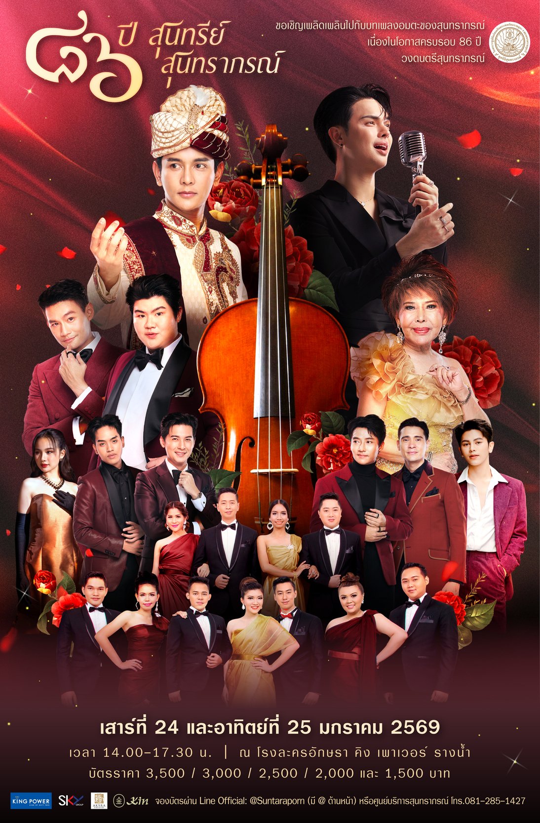 ร่วมขับขานบทเพลงอมตะไปพร้อมกันในคอนเสิร์ต “๘๖ ปี สุนทรีย์สุนทราภรณ์” จัดขึ้นในวันที่ 24–25 มกราคม 2569 ณ โรงละครอักษรา คิง พาวเวอร์ ถนนรางน้ำบัตรราคา 3,500 / 3,000 / 2,500 / 2,000 และ 1,500 บาท