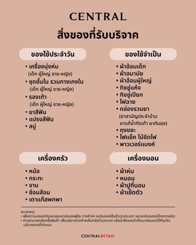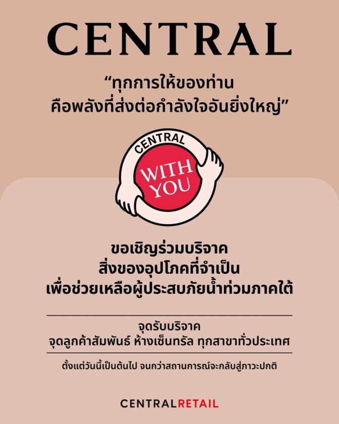 เพื่อเป็น “ศูนย์กลางเครือข่ายความช่วยเหลือ” ในทุกภูมิภาคของไทย ทางห้างได้เปิดจุดรับบริจาคสิ่งของจำเป็น ณ จุดบริการลูกค้าสัมพันธ์ของห้างเซ็นทรัลและห้างโรบินสันทุกสาขาทั่วประเทศ รวมทั้งบนแพลตฟอร์ม CENTRAL ONLINE และ CENTRAL APP: https://www.central.co.th/en/campaign/central-with-you เพื่อเป็นช่องทางให้ลูกค้า พนักงาน ผู้บริหาร และพันธมิตรแบรนด์ได้เข้ามาร่วมเป็นส่วนหนึ่งของภารกิจช่วยเหลือครั้งนี้ โดยของบริจาคทั้งหมดจะถูกรวบรวมอย่างเป็นระบบก่อนลำเลียงลงพื้นที่อำเภอหาดใหญ่และจังหวัดใกล้เคียง เพื่อส่งต่อให้ประชาชนที่ได้รับผลกระทบได้อย่างเร่งด่วนและทั่วถึงที่สุด