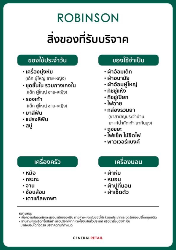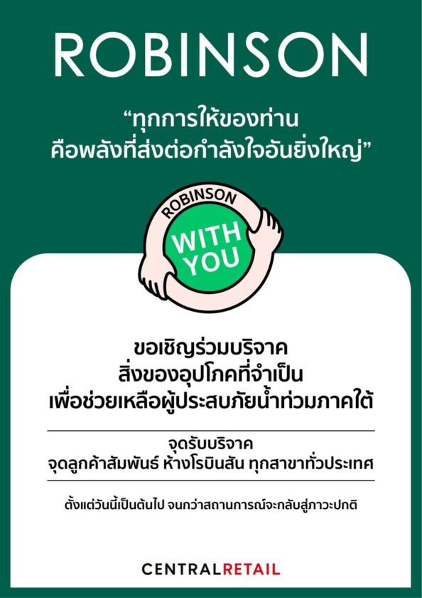 ห้างเซ็นทรัล และห้างโรบินสันยังคงติดตามสถานการณ์ในพื้นที่หาดใหญ่และภาคใต้อย่างใกล้ชิด พร้อมประเมินความต้องการของผู้ประสบภัยเป็นรายวัน เพื่อให้สามารถส่งมอบความช่วยเหลือได้อย่างตรงจุดที่สุด โดยมีการอัปเดต “รายการสิ่งของที่จำเป็น” ให้เหมาะสมกับสถานการณ์ในแต่ละช่วงเวลา ผ่านช่องทางของห้างอย่างต่อเนื่อง ลูกค้าและผู้สนใจสามารถติดตามคำแนะนำการบริจาค และเลือกส่งต่อสิ่งของที่ตรงกับความต้องการเร่งด่วนได้ทันที ช่วยให้ทุกพลังน้ำใจถูกส่งถึงผู้ประสบภัยอย่างมีประสิทธิภาพและเกิดประโยชน์สูงสุด