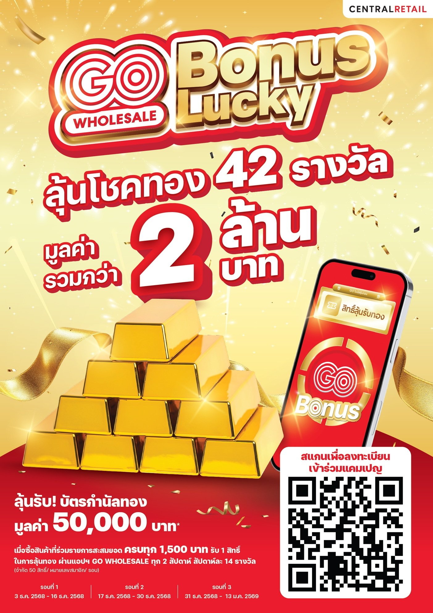 ระยะเวลาของ “GO Bonus GO Lucky” เริ่มตั้งแต่วันที่ 3 ธันวาคม 2568 – 13 มกราคม 2569 ที่ โก โฮลเซลล์ ทุกสาขาทั่วประเทศ และในแอปพลิเคชัน GO WHOLESALE ที่จะเป็นตัวช่วยไม่ทำให้เราพลาดทุกการจับรางวัลทั้ง 3 รอบ โดยผู้ลงทะเบียนเข้าร่วมแคมเปญ 200 คนแรกต่อรอบ จะได้รับบัตรกำนัลมูลค่า 100 บาท ส่วนผู้ที่มียอดซื้อสินค้าที่มียอดสะสมสูงสุด 500 คนต่อรอบ จะได้รับบัตรกำนัลมูลค่า 500 บาท