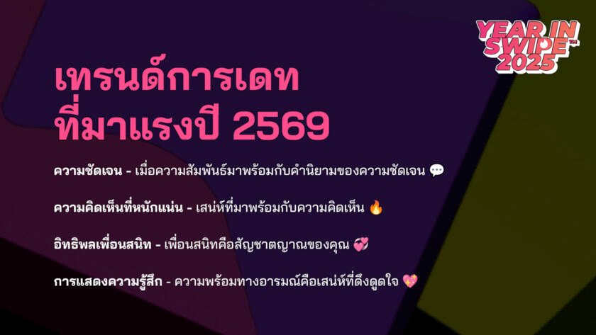 คนโสดที่กำลังมองหาคนรู้ใจในปี 2569 จะต้องบาลานซ์ระหว่างการพูดคุยและความรู้สึก โดยแสดงให้เห็นว่าต้องการเคมีที่มีความหมายแต่ไม่ซับซ้อนเกินไป 56% ให้ความสำคัญกับบทสนทนาที่จริงใจมากที่สุด 45% ต้องการความเห็นอกเห็นใจมากขึ้นหลังจากโดนปฏิเสธ และคำที่ใช้นิยามการเดทปี 256911 มากที่สุดคือ “มีความหวัง” เรียกได้ว่า ความหวังเป็นสิ่งที่กำลังมาแรง และคนโสดก็ไม่กลัวที่จะแสดงออกมา!