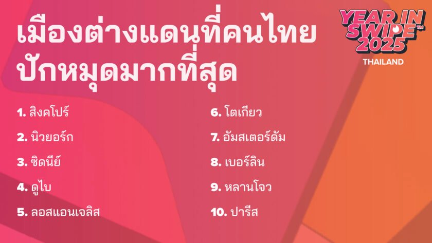 | จุดหมายที่คนไทยปัดหมุดมากที่สุด กรุงเทพมหานคร พัทยา เชียงใหม่ ขอนแก่น ปทุมธานี หาดใหญ่ นครราชสีมา ภูเก็ต นครปฐม 10.อุดรธานี | เมืองต่างแดนที่คนไทยปักหมุดมากที่สุด สิงคโปร์ นิวยอร์ก ซิดนีย์ ดูไบ ลอสแอนเจลิส โตเกียว อัมสเตอร์ดัม เบอร์ลิน หลานโจว 10.ปารีส |