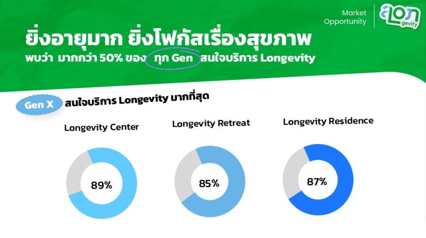 ได้เร็ว และมีบทบาทสำคัญในการบุกเบิกดีมานด์และปูทางให้ตลาด Longevity เติบโตในระยะยาว ส่วน Gen Y ข้อมูลชี้ชัดว่ากลุ่มนี้มีความพร้อมและมีกำลังจ่ายสูงจึงเป็น “Sweet Spot” หรือกลุ่มทองคำ ของธุรกิจที่ต้องการพัฒนาแพ็กเกจสุขภาพเชิงประสบการณ์ แบรนด์ที่สามารถสร้างความน่าเชื่อถือ สร้างสรรค์เนื้อหาเพื่อสื่อสารได้อย่างที่ชัดเจนและเชื่อมโยงกับคุณค่าด้านความยั่งยืน คุณภาพชีวิต และสมดุลชีวิตการทำงาน จะมีโอกาสครองใจกลุ่มนี้ได้มากเป็นพิเศษขณะที่ Gen X ก็เป็นกลุ่มที่พร้อมใช้และพร้อมจ่ายอย่างจริงจัง โดยเฉพาะบริการ Longevity Center, Longevity Retreat และ Longevity Residence เหมาะอย่างยิ่งสำหรับธุรกิจที่เน้น “บริการเชิงลึกและเชื่อถือได้” ทั้งศูนย์ดูแลสุขภาพแบบองค์รวม โรงพยาบาลและคลินิกเฉพาะทาง ไปจนถึงที่อยู่อาศัยที่มีบริการดูแลสุขภาพครบวงจร