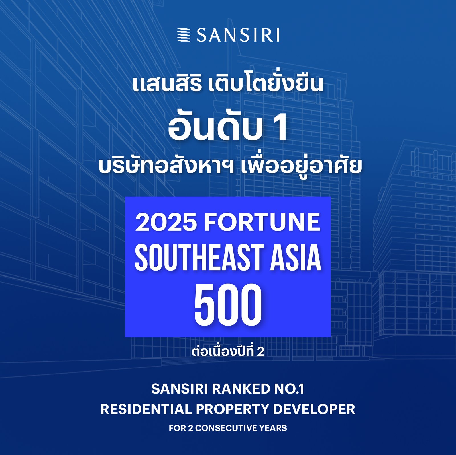 การขับเคลื่อนทั้งหมดนี้ดำเนินไปพร้อมกับพันธกิจด้านสิ่งแวดล้อมอย่างเป้าหมาย Net-Zero ในปี 2050 ซึ่งความมุ่งมั่นทุ่มเททั้งในมิติของธุรกิจและความยั่งยืนได้รับการการันตีผ่านรางวัลและการยอมรับจากองค์กรระดับสากล เริ่มตั้งแต่การได้รับการจัดอันดับใน 2025 Fortune Southeast Asia 500 ต่อเนื่องเป็นปีที่ 2 โดยยืนหยัดเป็นอันดับ 1 ในกลุ่มอสังหาฯเพื่ออยู่อาศัยของไทยควบคู่ไปกับการคว้ารางวัลจากในและต่างประเทศรวมกว่า 50 รางวัล