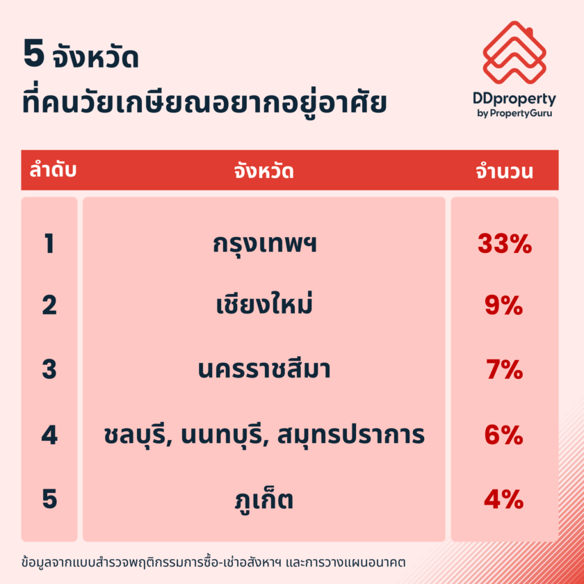 สำหรับเมืองที่ผู้บริโภคต้องการไปใช้ชีวิตหลังเกษียณมากที่สุด ได้แก่ กรุงเทพมหานคร (33%) ด้วยจุดเด่นของการเป็นเมืองหลวงที่มีความพร้อมรอบด้าน ทั้งระบบสาธารณูปโภคที่ครบครัน ตลอดจนสถานพยาบาลที่มีมาตรฐานและมีเทคโนโลยีทางการแพทย์ที่ทันสมัย จึงสามารถรองรับการดูแลสุขภาพในระยะยาวได้อย่างมั่นใจ รองลงมาคือ เชียงใหม่ (9%), นครราชสีมา (7%), ชลบุรี นนทบุรี สมุทรปราการ (สัดส่วนเท่ากันที่ 6%) และภูเก็ต (4%) ขณะที่อีก 11% เผยว่าไม่มีทำเลไหนที่สนใจเป็นพิเศษ ขอแค่อยู่ในประเทศไทยก็พอ
