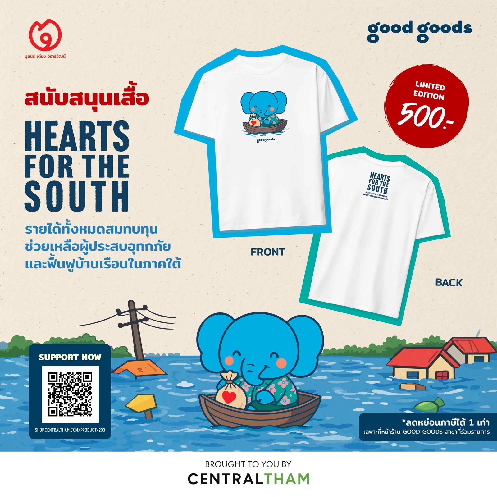 ทั้งนี้ ผู้ร่วมสนับสนุนทุกๆ 500 บาท จะได้รับ เสื้อยืด “Hearts For The South” 1 ตัวจากกุ๊ดกุ๊ดส์ เพื่อเป็นสัญลักษณ์แห่งการแบ่งปันและการมีส่วนร่วมในการช่วยเหลือสังคม ทั้งนี้ รายได้จากการสนับสนุนทั้งหมดไม่หักค่าใช้จ่ายมอบให้แก่มูลนิธิเตียงจิราธิวัฒน์เพื่อนำไปจัดซื้อสิ่งจำเป็นและสนับสนุนการฟื้นฟูพื้นที่ประสบอุทกภัยหลังน้ำลด