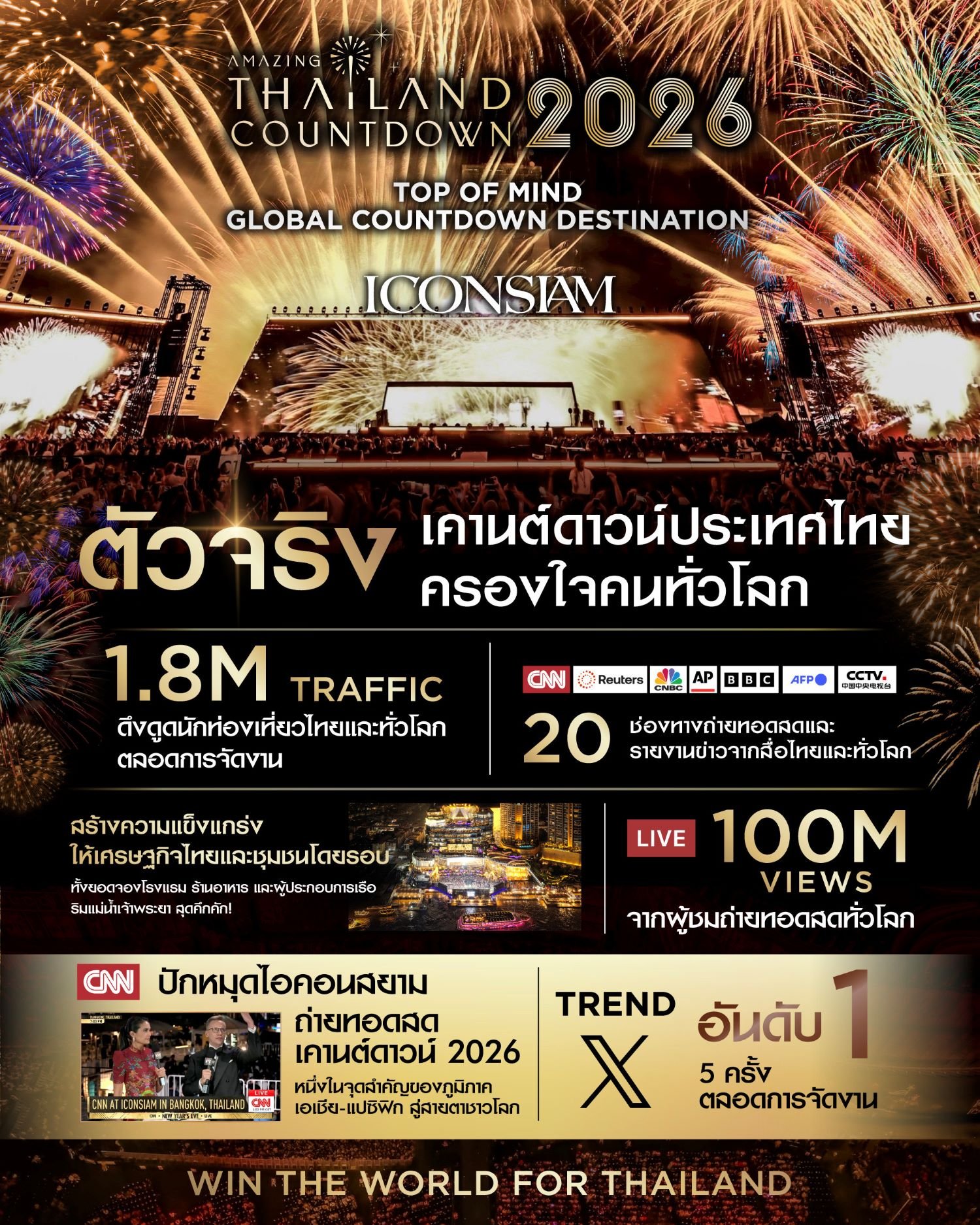 งาน Amazing Thailand Countdown 2026 ณไอคอนสยาม เป็นศูนย์กลางเฉลิมฉลองส่งท้ายปีที่ดึงดูดชาวไทยและนักท่องเที่ยวจากนานาประเทศ มากกว่า 1.8 ล้านคน พร้อมสร้างการรับชมถ่ายทอดสดและคอนเทนต์ที่เกี่ยวข้องจากทั่วโลกหลายร้อยล้านวิว ผ่านสื่อระดับนานาชาติและแพลตฟอร์มดิจิทัล ขณะที่กระแสบนโซเชียลมีเดียพุ่งขึ้นติด อันดับ 1 เทรนด์บนแพลตฟอร์ม X และอีกหลายแพลตฟอร์ม ตอกย้ำสถานะของไอคอนสยามในฐานะ Global Experiential Destination ในทุกเทศกาลของประเทศไทยอย่างแท้จริง