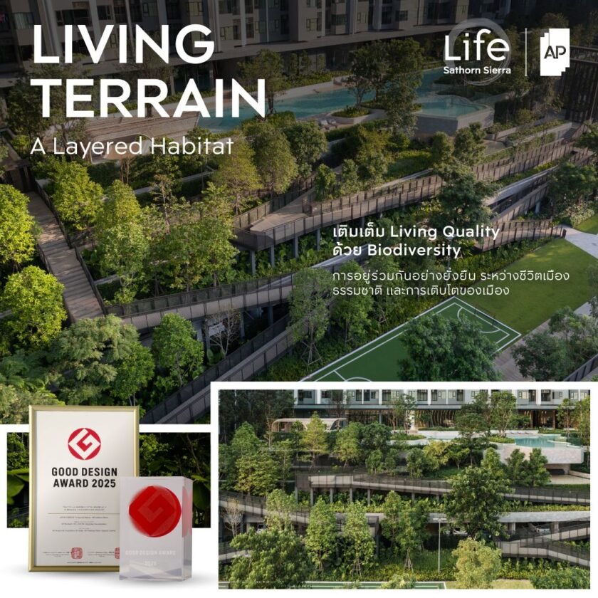 LIFE Sathorn Sierra – LIVING TERRAIN: A Layered Habitat ก็คว้ารางวัล Good Design Award ด้วยความโดดเด่นจากการออกแบบพื้นที่ส่วนกลางในโครงการคอนโดมิเนียม ที่คำนึงถึงบริบทของธรรมชาติและการสร้างสภาพแวดล้อมที่เชื่อมโยงถึงกัน (Layered Habitat) เพื่อมอบประสบการณ์การอยู่อาศัยและคุณภาพชีวิตที่อุดมสมบูรณ์และเป็นมิตรต่อทั้งผู้อยู่อาศัยในโครงการ นกผีเสื้อแมลงต่างๆต้นไม้และเมือง
