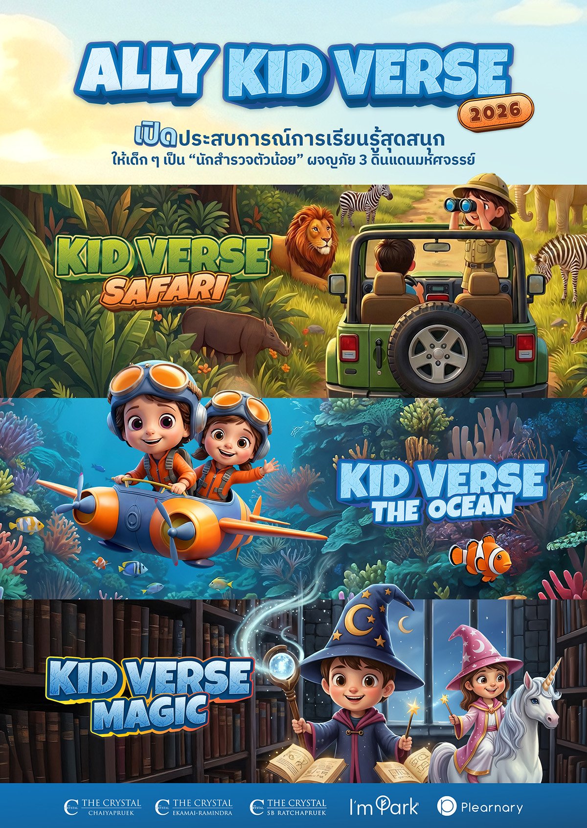 ภายใต้คอนเซปต์ The Journey of Explorers งาน ALLY Kidverse 2026 จะพาเด็ก ๆ ตะลุยความสนุกผ่าน 3 ดินแดนมหัศจรรย์ ที่ออกแบบมาเพื่อผสมผสานทั้งความสนุกและการเรียนรู้ไว้ในงานเดียว ได้แก่ ดินแดนซาฟารี (Safari) ดินแดนโลกใต้ทะเล (The Ocean) และดินแดนเวทมนตร์ (Magic) โดยแต่ละโซนมีกิจกรรมหลากหลายให้เด็ก ๆ ได้ลงมือทำจริง เรียนรู้ผ่านประสบการณ์ และสร้างความทรงจำที่น่าประทับใจในช่วงวันเด็กปีนี้